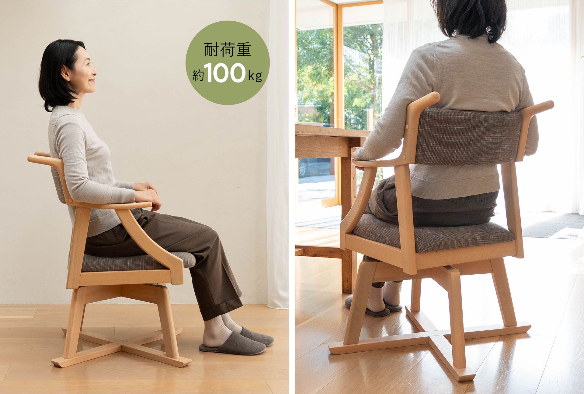 手を自然に置ける高さで立ち上がりをやさしくサポートし、ダイニングテーブルに干渉しづらい短めの設計により、座る・立つ・向きを変える動作もスムーズに行えます。