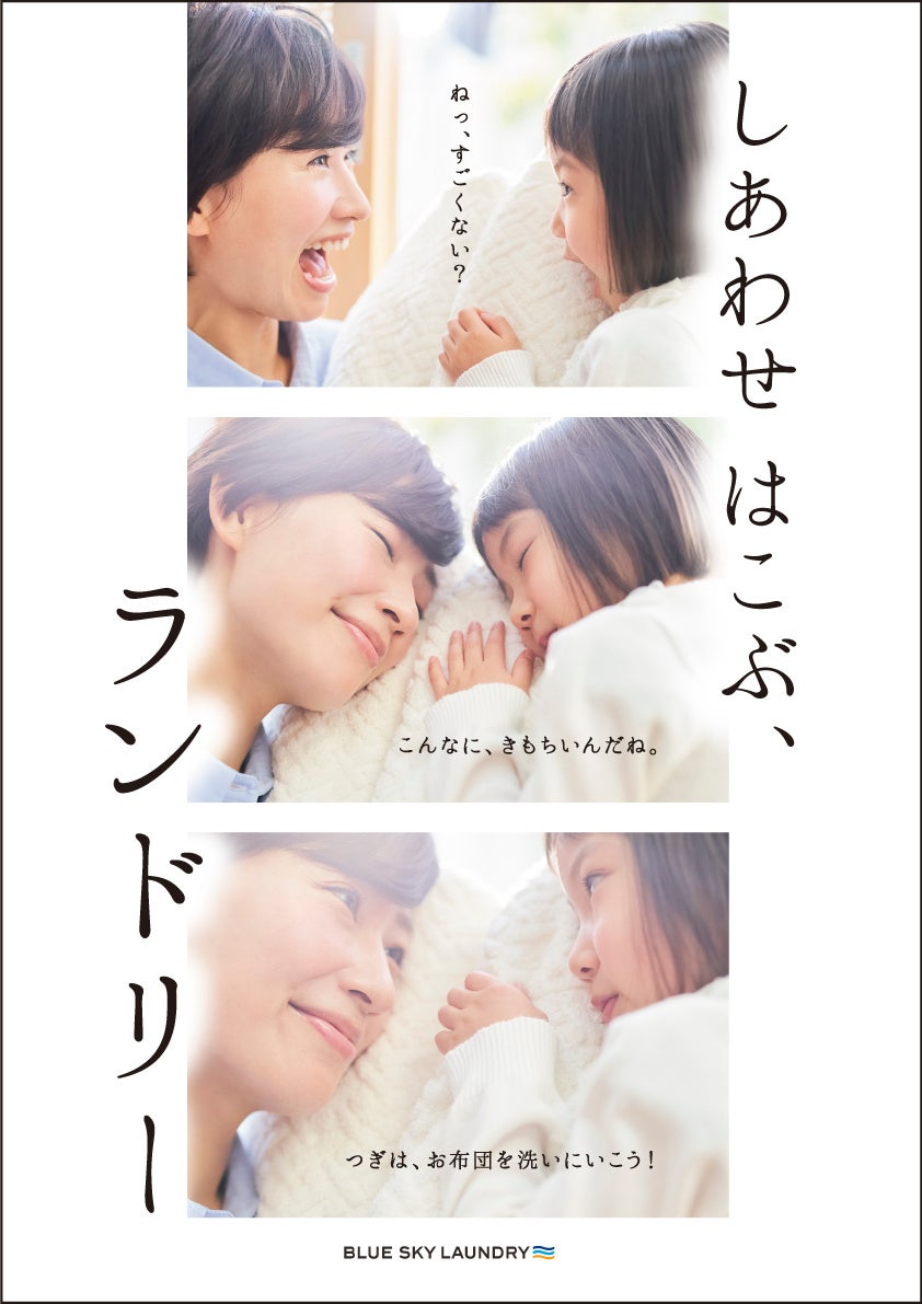 新キャッチコピー『しあわせ はこぶ、ランドリー』は、家族全員が共感できる幸せなコインランドリー空間をコンセプトに採用しています。ブルースカイランドリーに足を運ぶだけで幸福感を感じ、洗濯をすることで、家族の笑顔と幸せなひとときを共有できるイメージを象徴しています。