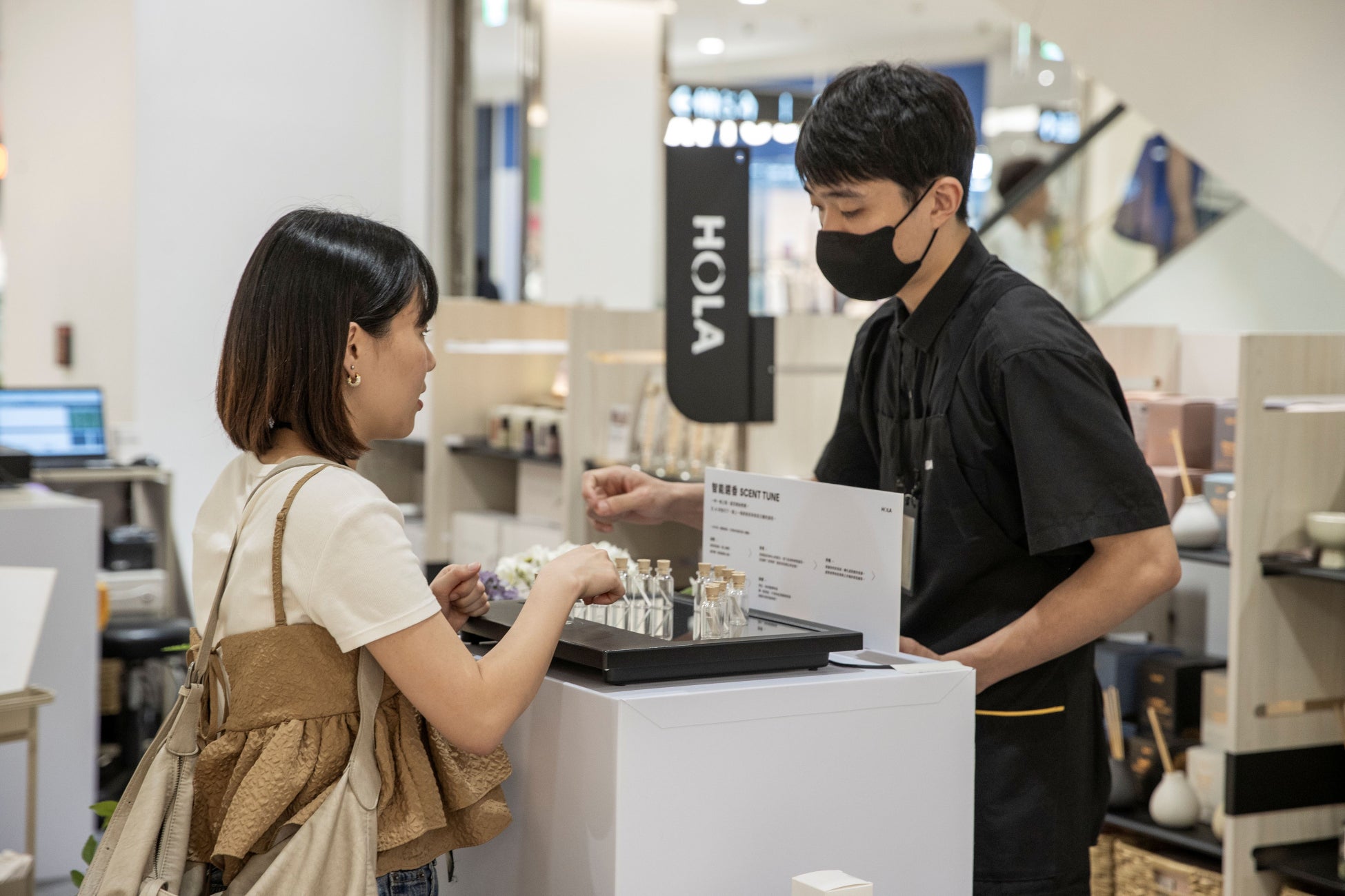 ポップアップストアでは、香りを言語化するAI「KAORIUM」を設置しております。KAORIUMの診断を通じて、HOLAのアイテムの中から、自分に合う香りを選ぶことができます。