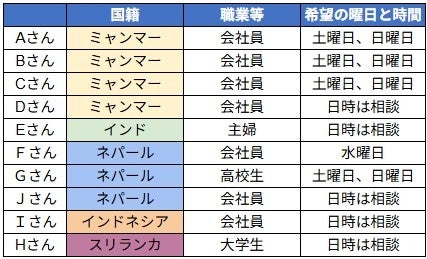 「日本語トークセッション」(3期)では、ミャンマー人、インド人、ネパール人、インドネシア人、スリランカ人の合計10人がエントリーして皆さんの参加を待っています。