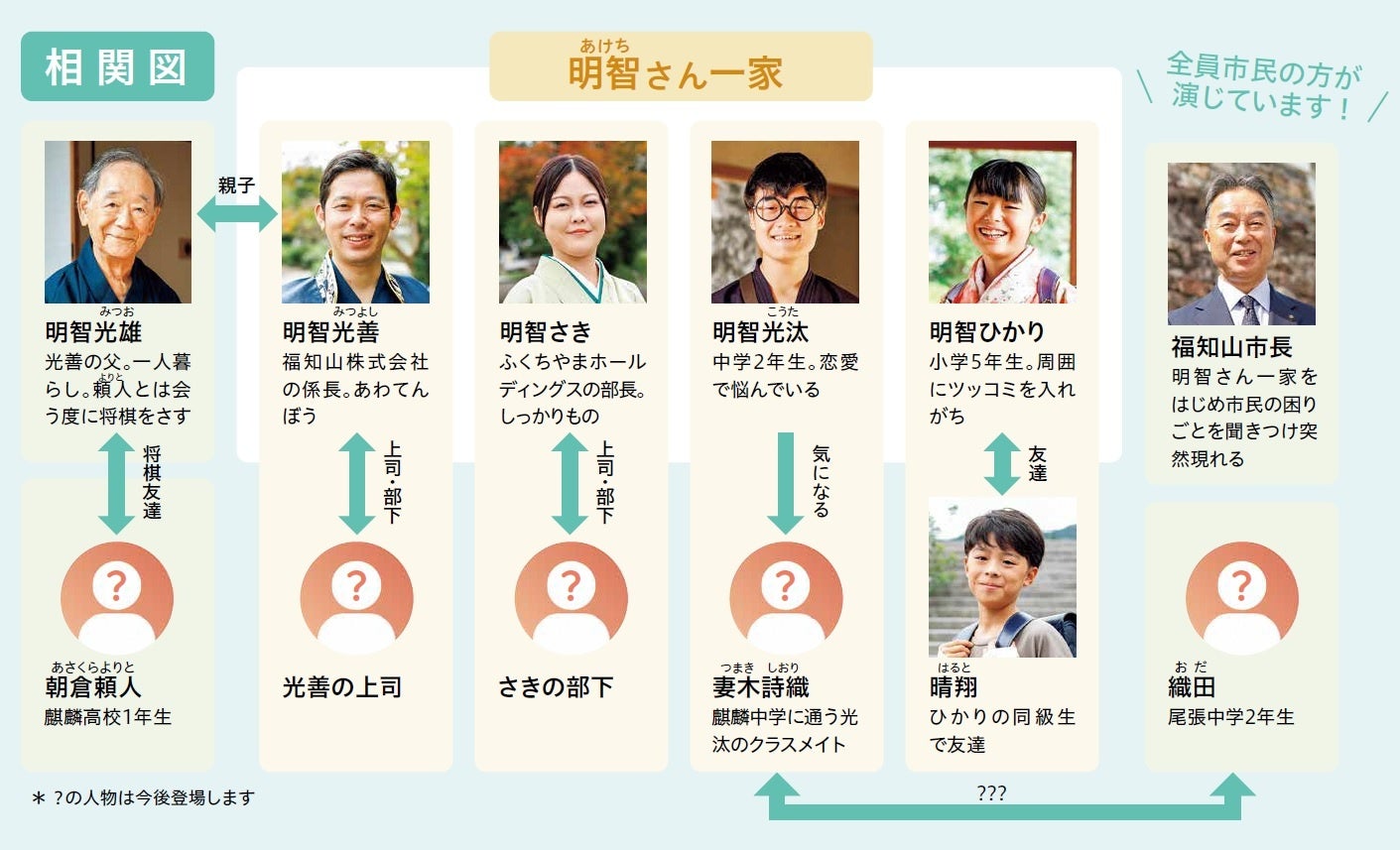 現代の福知山市で暮らすちょっと古風な“明智さん一家”を、日ごろ演劇活動を行う市民が個性たっぷりに演じるほか、福知山市長も出演する、全国でも珍しい市政×市民×映像の広報プロジェクトです。「市民と共につくる広報」を通して市民と市の距離を縮め、「風通しのいい」まちづくりをめざします。