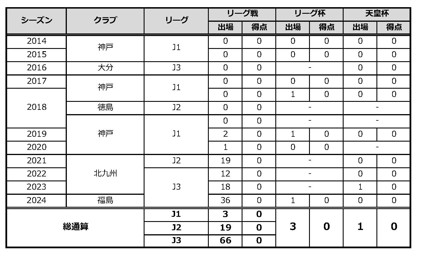 サッカー歴:川東サッカースポーツ少年団→セレソン都城→ヴィッセル神戸U-18→ヴィッセル神戸→大分トリニータ→ヴィッセル神戸→徳島ヴォルティス→ヴィッセル神戸→ギラヴァンツ北九州→福島ユナイテッドFC