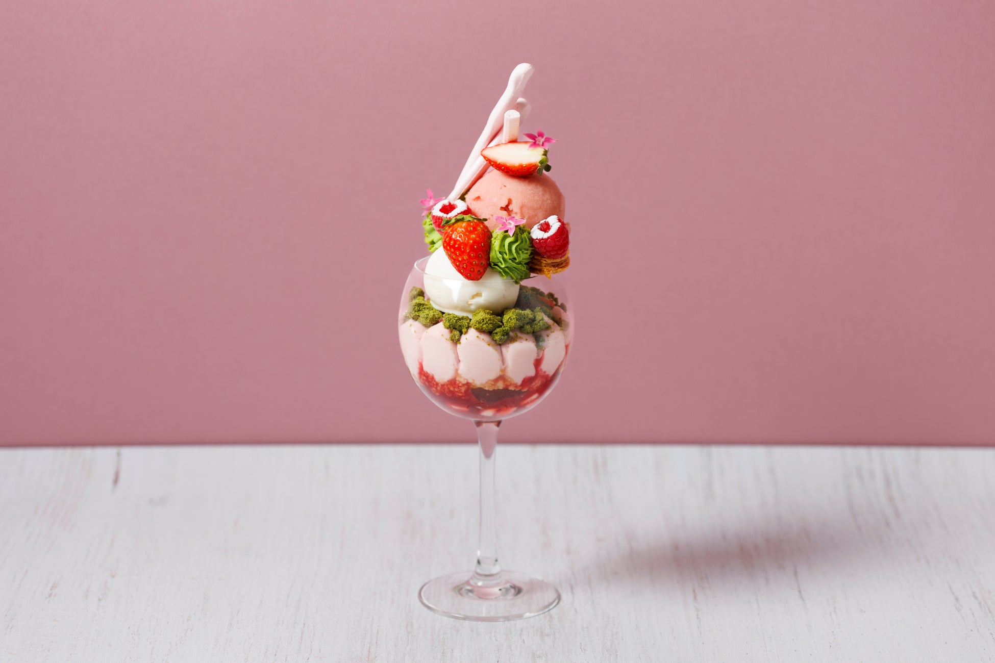 苺と抹茶を組み合わせた新作パフェが登場。濃厚な抹茶パンナコッタとサクサクの抹茶クランブルが、甘酸っぱい苺の風味を引き立てます。さらに、ベリー系のトッピングや香り豊かな紅茶のジュレを加えることで、味わいに深みを持たせました。和と洋の融合を楽しめる、贅沢な一品です。