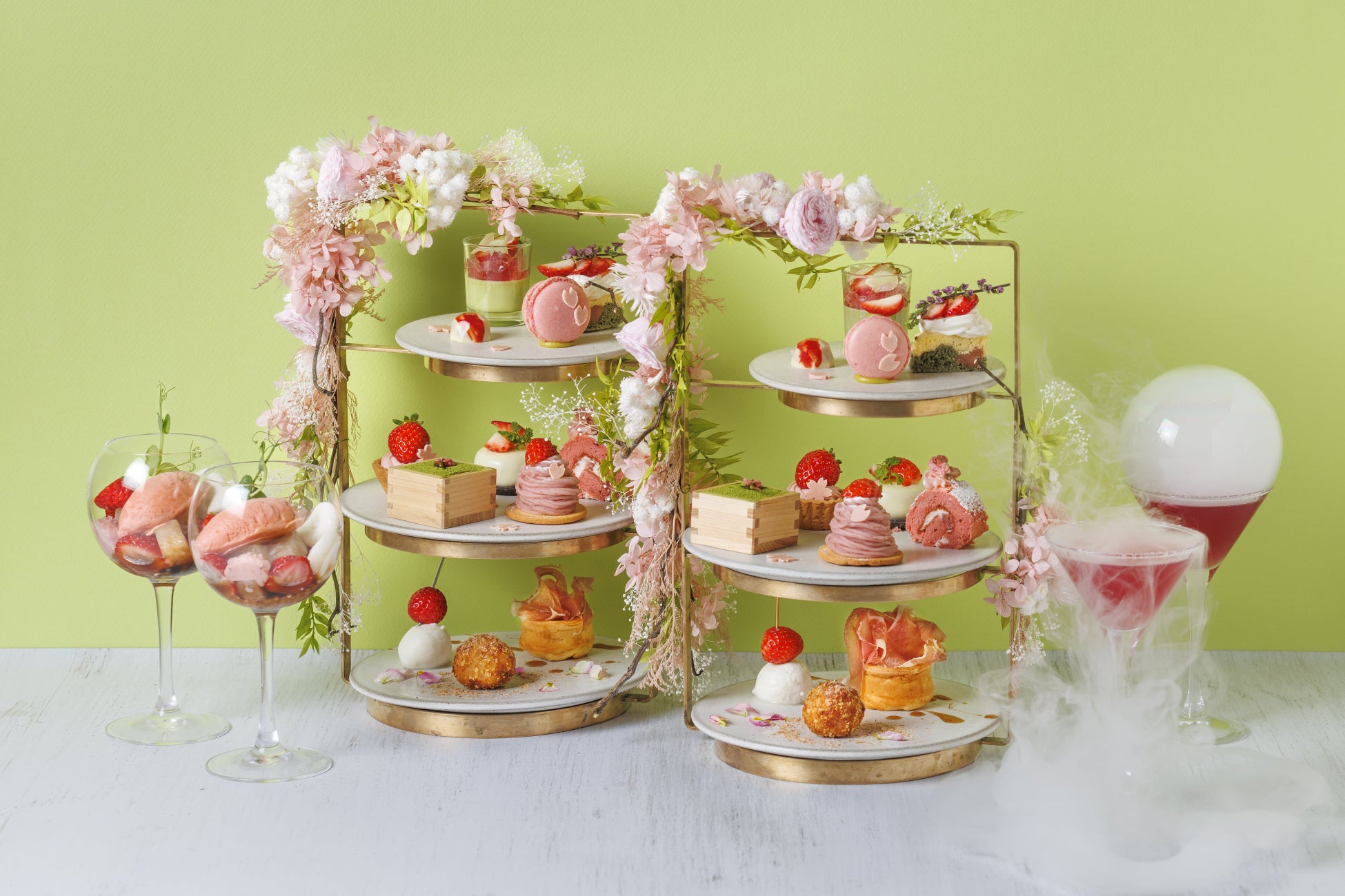 メニュー内容:抹茶と桜のヴェリーヌ/よもぎの浮島と苺/ピスタチオ苺マカロン/苺と桜のボンボンショコラ/苺と桜のモンブラン/抹茶ティラミス/苺練乳ロールケーキ/ほうじ茶きな粉と苺のムース/苺と桜のレアチーズタルト/苺のカプレーゼ/桜海老のアランチーニ/生ハムメープルパンケーキ