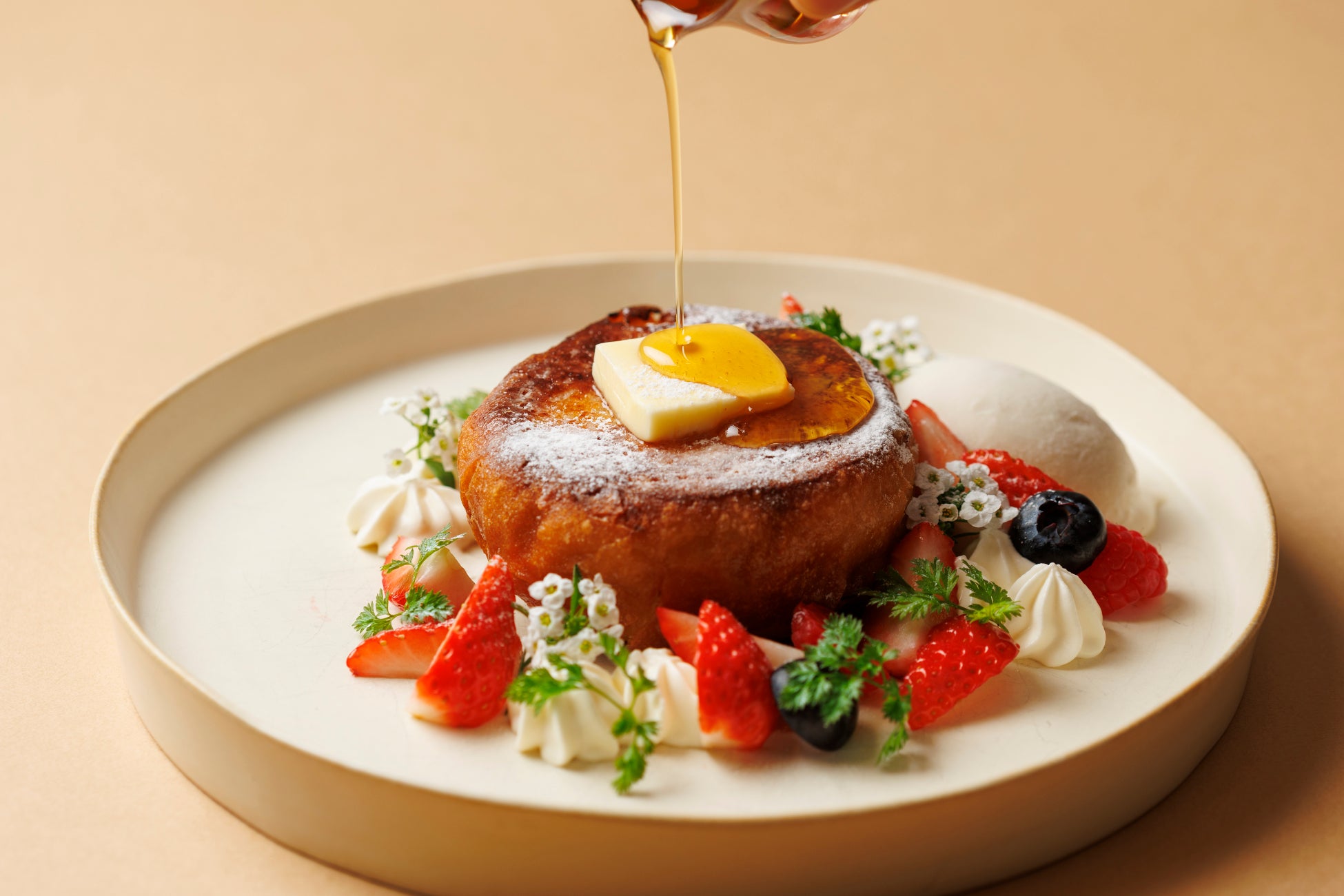 生クリームをたっぷり使った自家製のまあるいパンを、バニラビーンズ香るアパレイユにじっくり浸し、ふんわり焼き上げました。仕上げにはキャラメリゼを施し、カリッとした食感と中のふわふわ感が絶妙なコントラストを生み出します。甘酸っぱい苺と自家製アーモンドアイスとともにお楽しみください。