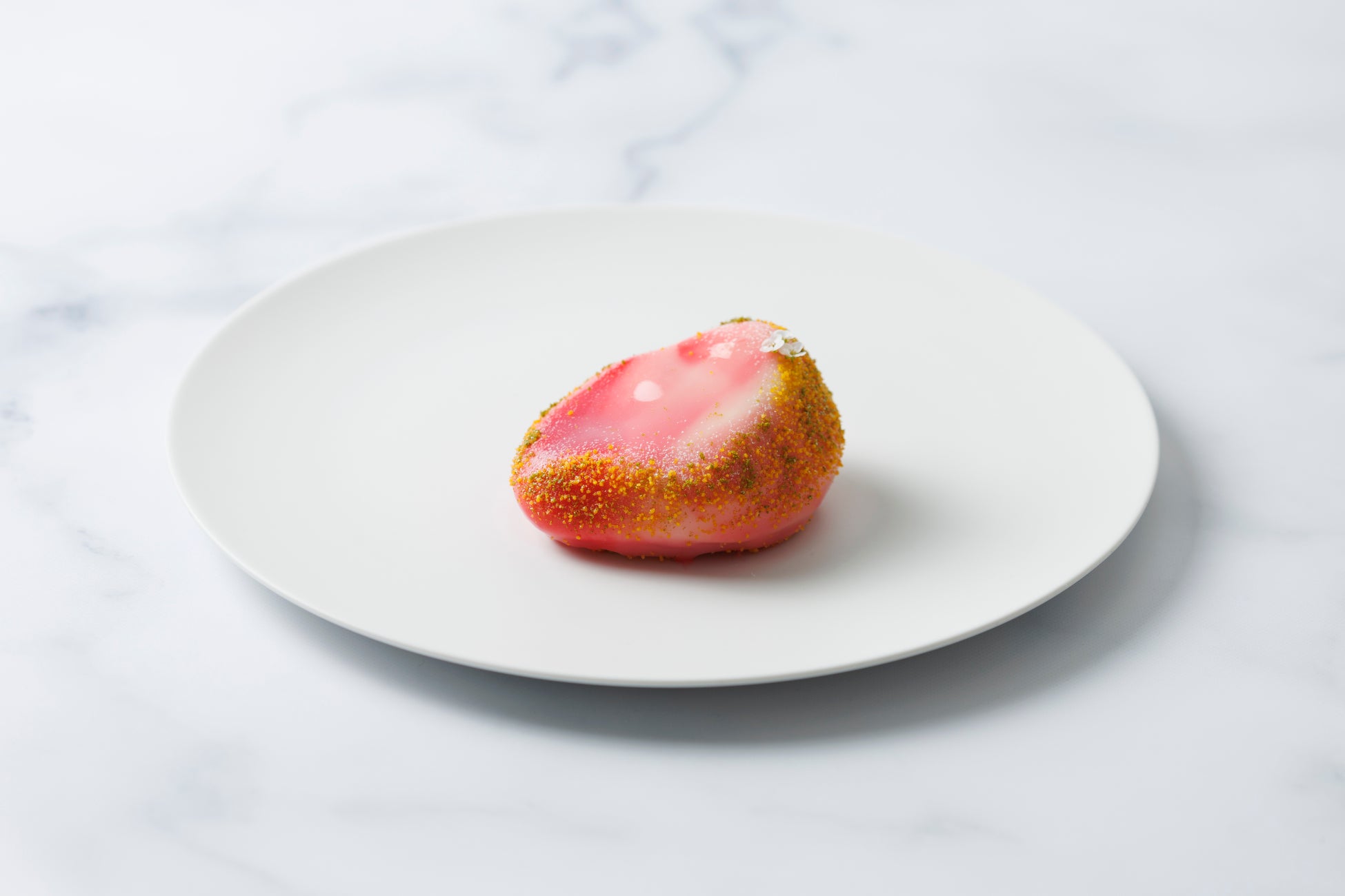 西行法師の和歌から着想を得て、桜を使わずに桜の味を表現した春限定デセール。満開の丘をイメージしたフォルムに、パッションフルーツと抹茶パウダーで春の芽吹きを演出。チェリーとトンカ豆のクリーム、ベルガモットのムースを忍ばせ、草原で夜空を眺める情景を表現。RAUならではの解釈で、西行の世界観を味わえる一品です。