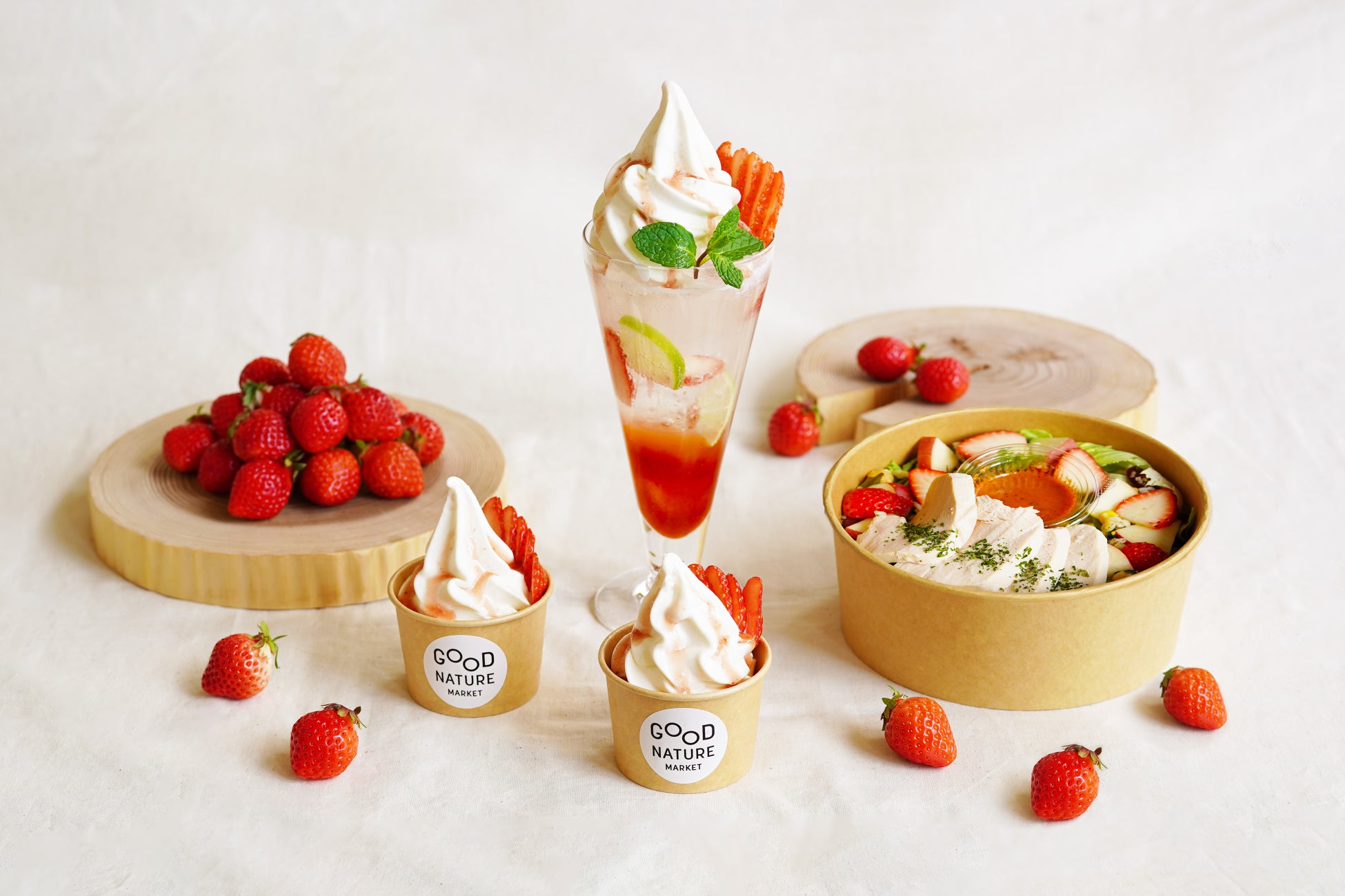 京都府産の苺と美山牛乳を使用したミルキーなソフトクリーム、爽やかな酸味が魅力の京いちごソーダ、そして塩麴で漬けた自家製鶏ハムに京いちごと林檎を添えたボリューム満点のサラダなど、ヘルシーながら春らしい味覚を存分に楽しめるメニューが揃いました。