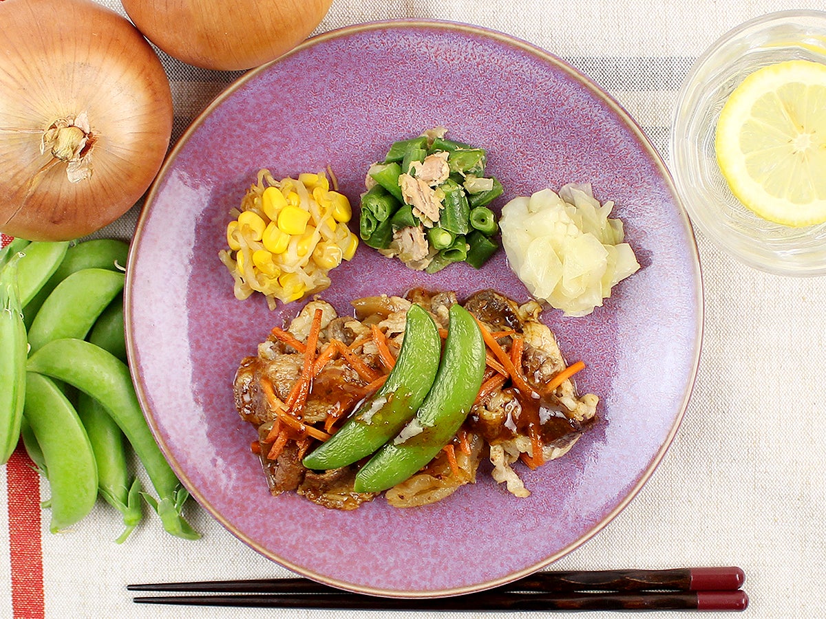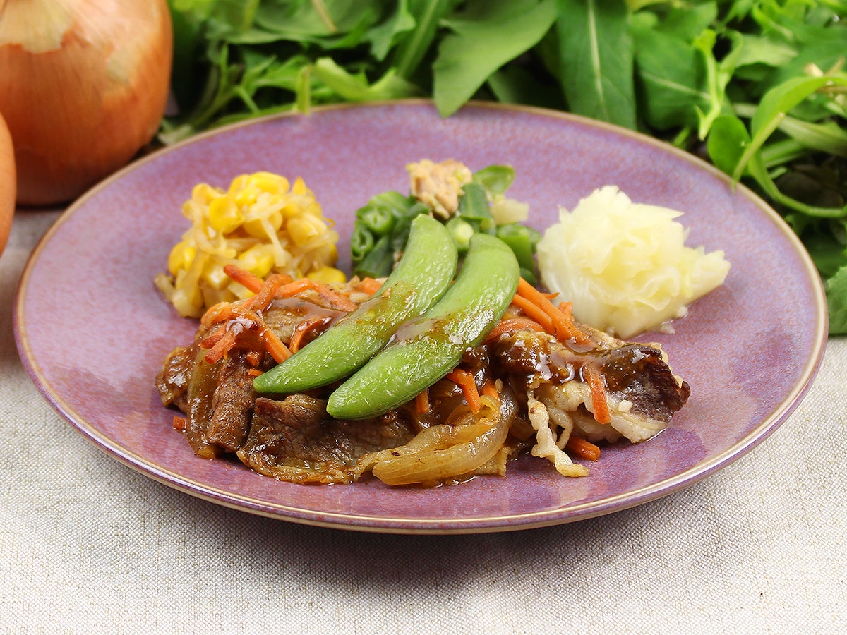 薄くスライスした牛バラ肉と、玉ねぎ、人参、スナップエンドウのエスニック炒めです。魚介の旨味と香辛料の効いた台湾の調味料である沙茶醤(サーチャジャン)やナンプラー、オイスターソースをベースにしたソースで仕上げました。独特な香りと辛味が癖になるお味となっております。