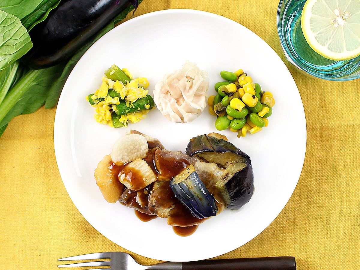 厚めにカットした豚肩ロースを塩麹で下味をつけてローストいたしました。添え野菜には、茄子と山芋を使用し、濃厚なオイスターソースをかけました。よく混ぜてお召し上がりください。
