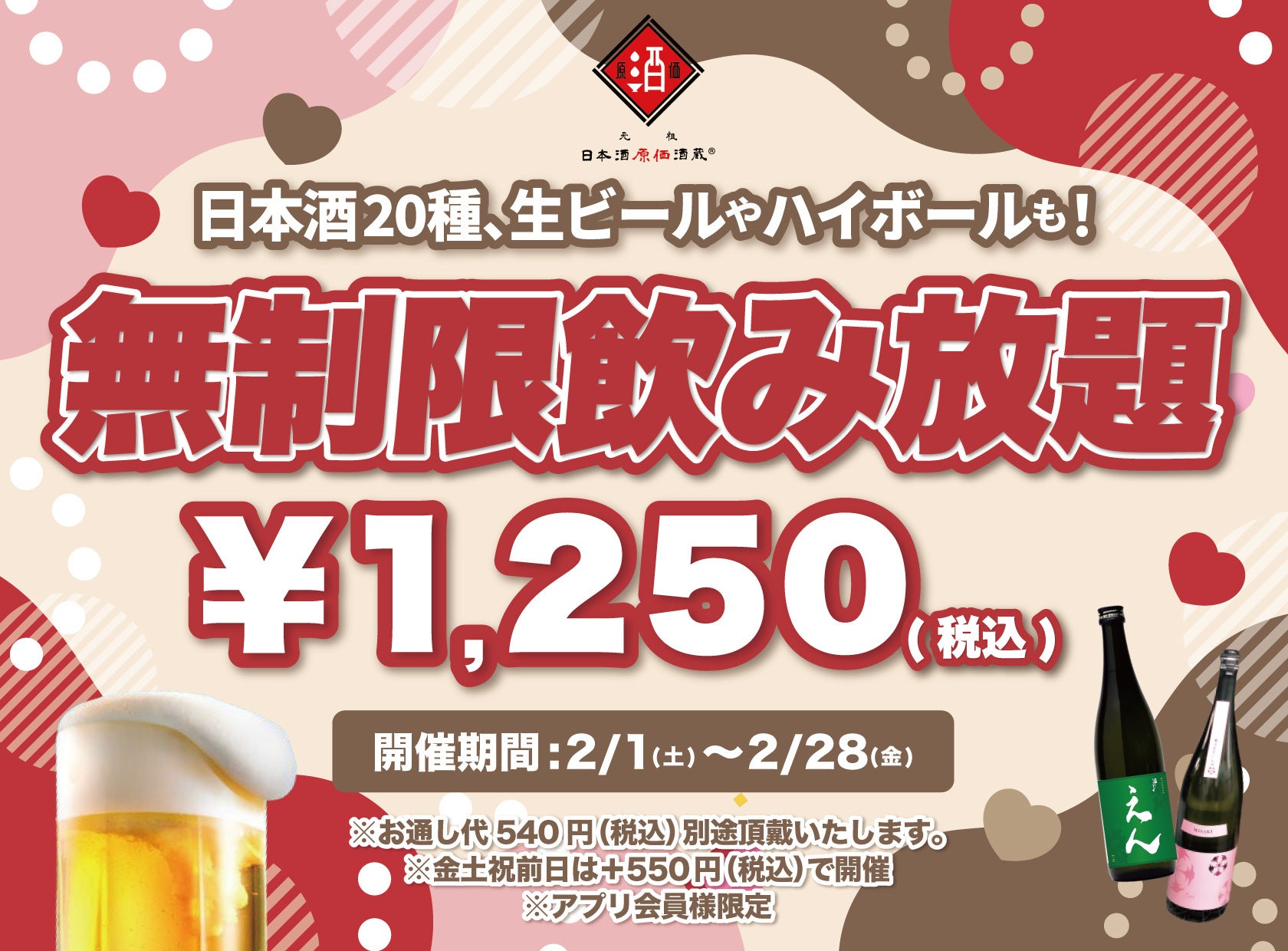 【大好評につき2月も開催】全店で時間無制限飲み放題が¥1250(税込)!
