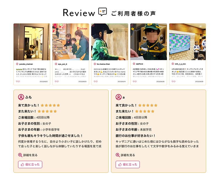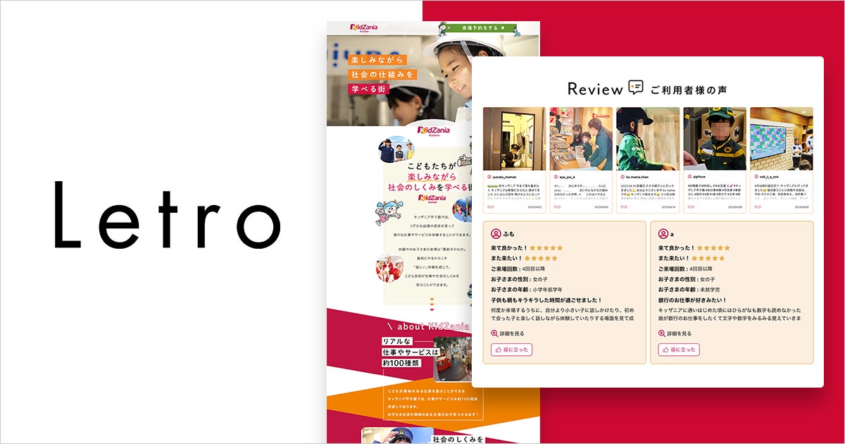 お客様にスムーズに来場予約いただくためのサイト設計・運営に注力するキッザニアでは、キッザニアの公式サイトにおいて、キッザニアを利用したお客様によって投稿されたUGCを最適な形・内容で設置することで、サイト訪問者の予約率及びユーザー体験の向上を図るために「Letro」が活用されています。