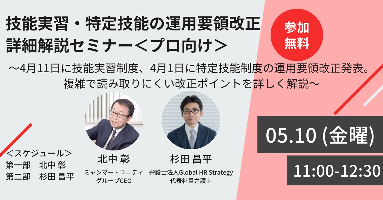 【プロ向け】技能実習・特定技能の運用要領改正詳細解説セミナー<5/10 11時無料生配信>~4月11日に技能実習制度、4月1日に特定技能制度の運用要領改正発表。改正ポイントを詳しく解説~