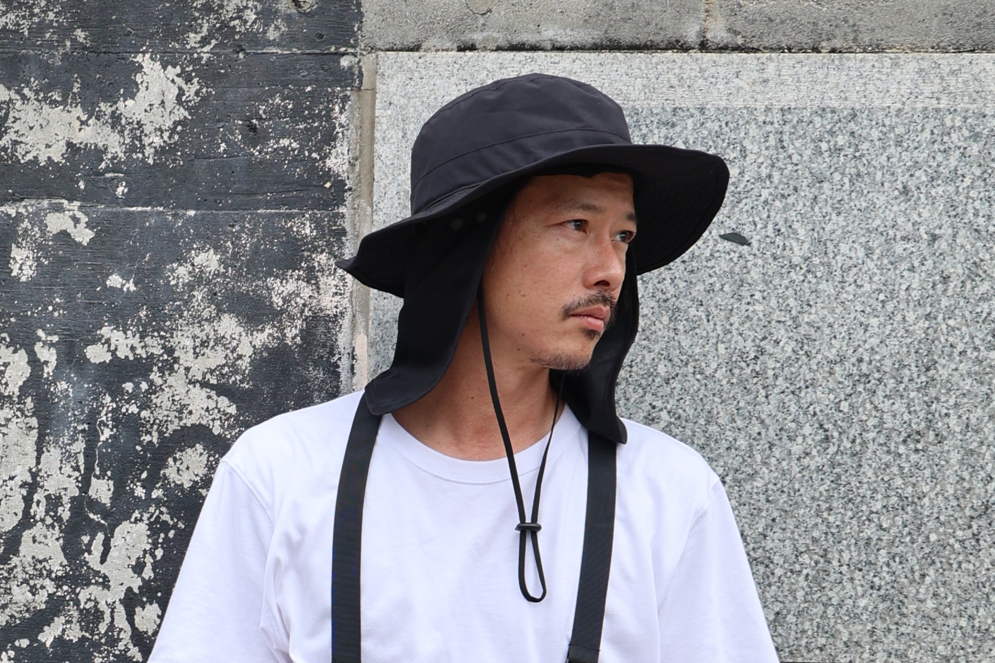 サファリハットにシェードを取り付け、さらに照り返し対策として鼻から下を覆うマスク部分をプラスしました。