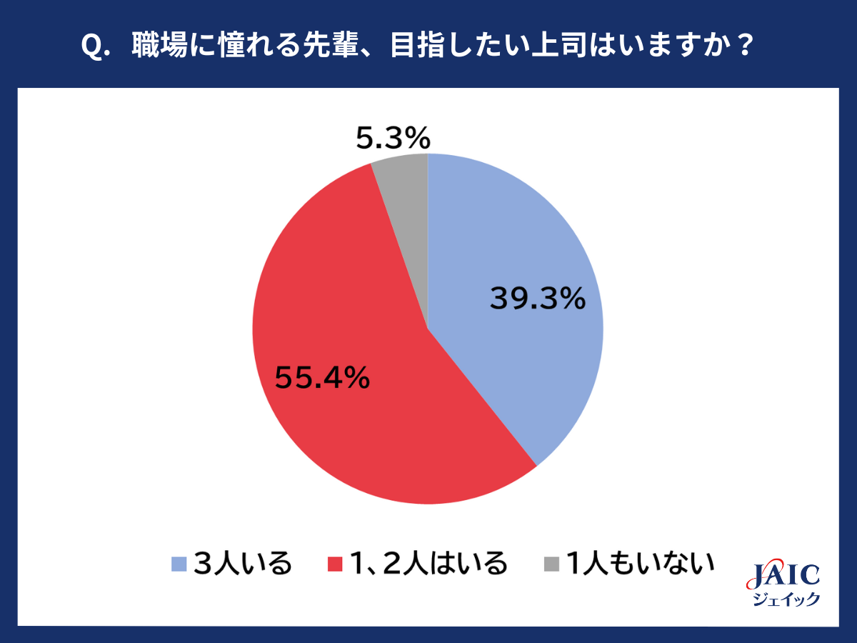 「職場に憧れる先輩、目指したい上司はいますか?」と質問したところ、「1、2人はいる」が55.4%と最も多く、次いで「3人いる」が39.3%という結果となり、全体の9割以上が「職場に憧れる先輩や目指したい上司」が1人以上いることがわかりました。