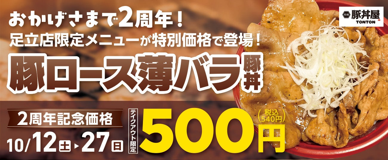 ワンズトライン株式会社(本社:大阪市北区芝田2丁目3番16号、代表取締役:山内仁)が運営する、北海道・帯広伝統の豚丼が人気の「元祖豚丼屋TONTON 足立店」(住所:東京都足立区保木間2-31-5、TEL:03-4362-5853)が2周年を記念して、店舗限定メニュー「豚ロース薄バラ豚丼」を期間限定価格で販売いたします。