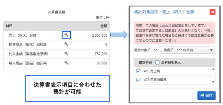 所得税申告に必要な、貸借対照表・損益計算書・製造原価報告書、月別売上・仕入金額を連携します。それぞれ決算書表示項目に合わせて複数科目の集計が可能となっており、freee申告連携時の科目マッピングや金額合算処理が不要となります。同時に、消費税申告に必要な消費税区分別の取引金額、消費税額もfreee税区分に合わせて自動集計され、調整することなくスムーズに連携することが可能です。また、設定は翌年にも引き継がれるため、毎年業務を効率化することが可能です。