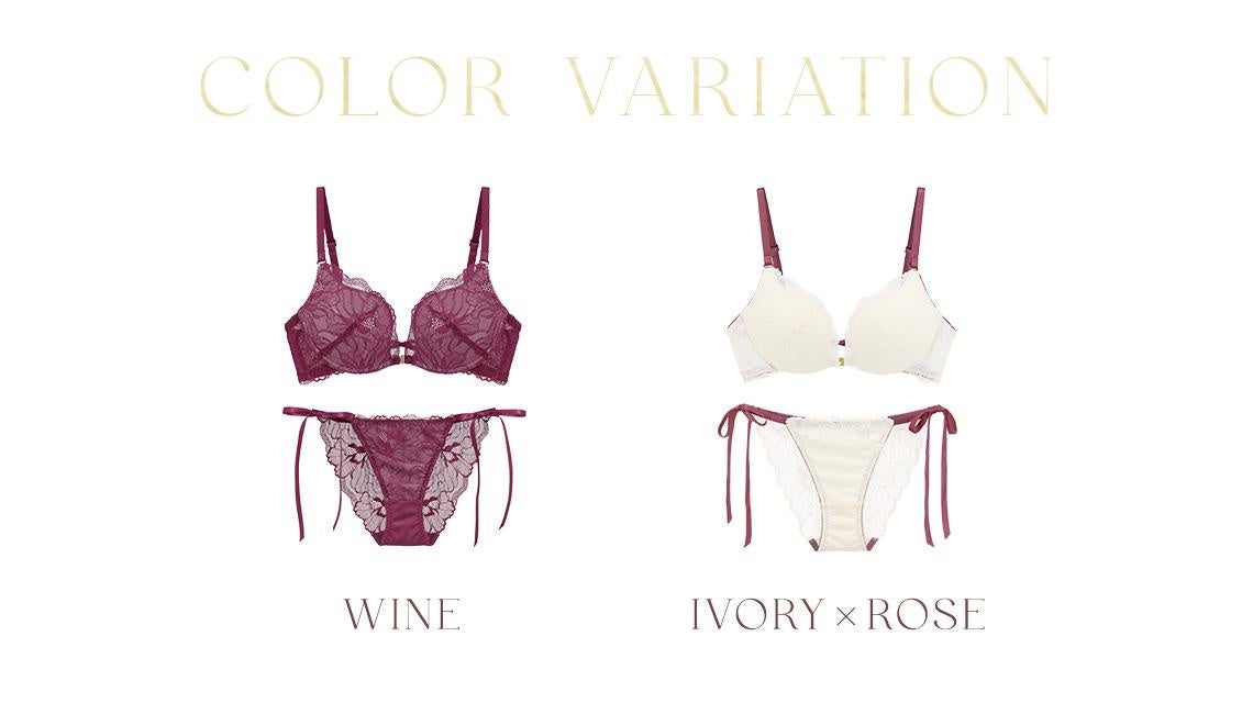 カラーバリエーションは全8色。現在販売中の6色に加え、ブラ本体とバイカラーのリボンがポイントのホリデーカラーの2色が新登場。フロントに施されたゴールドホックと、芍薬をモチーフにした総レースがデザインのポイントとなっています。