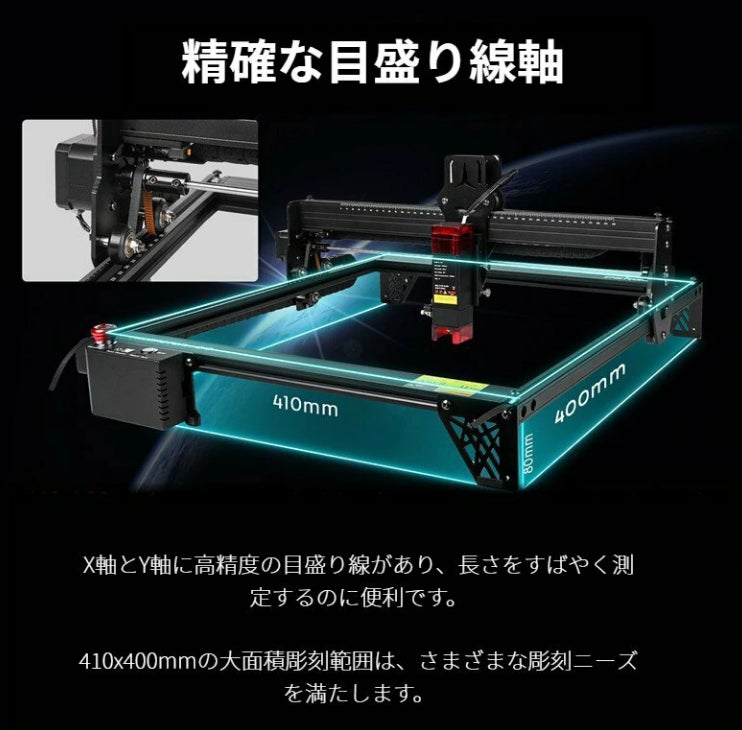 X軸とY軸に高精度の目盛り線があり、長さをすばやく測定するのに便利です。 410x400mmの大面積彫刻範囲は、さまざまな彫刻ニーズを満たします。