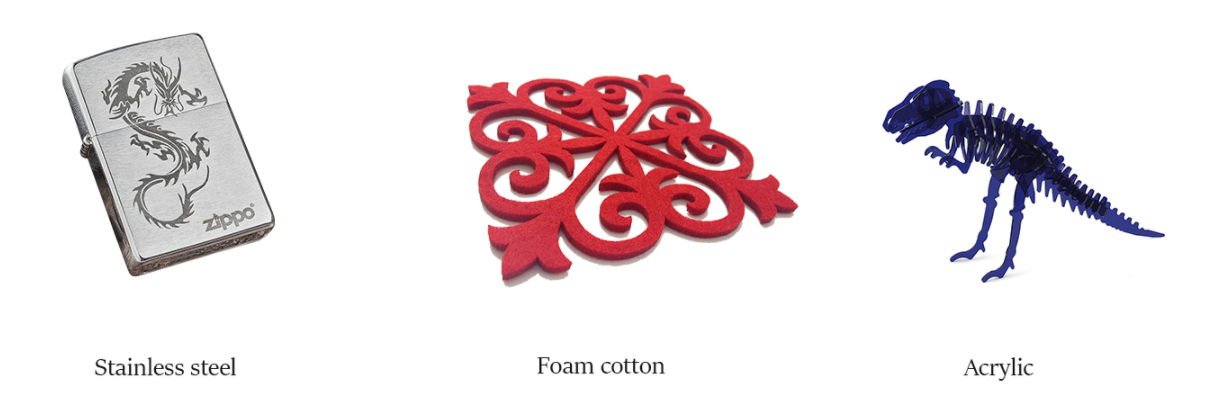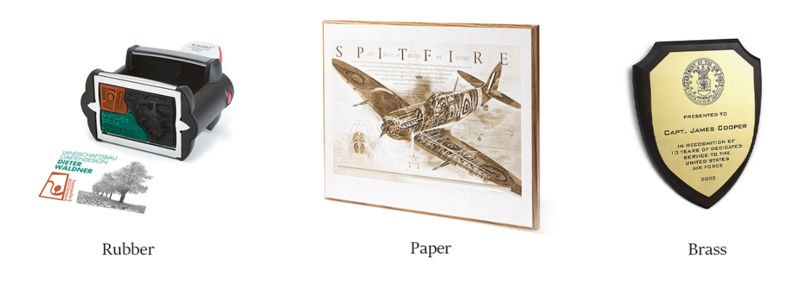 - 彫刻材料:木、竹、ボール紙、プラスチック、革、MDF、スレート、漆塗りの金属、鏡のステンレス鋼。