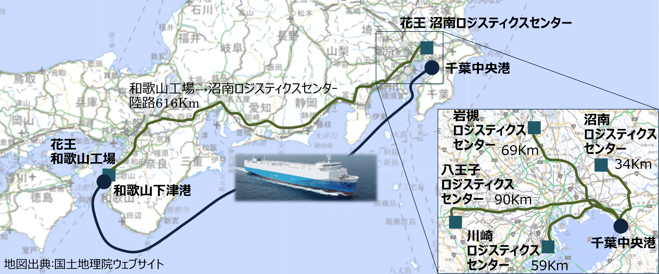 本取り組みでは、和歌山工場から約1kmの和歌山下津港において、製品を積載したトレーラーを愛媛県の大王海運が運行するRORO船※1に積み込み、ドライバーは運転車両を切り離して下船、トレーラーのみ千葉中央港へ海上輸送します。千葉中央港に到着後は別のトラックドライバーが運転車両をトレーラーに連結して、沼南(千葉県)、岩槻(埼玉県)、八王子(東京都)、川崎(神奈川県)の各物流拠点へ輸送します。