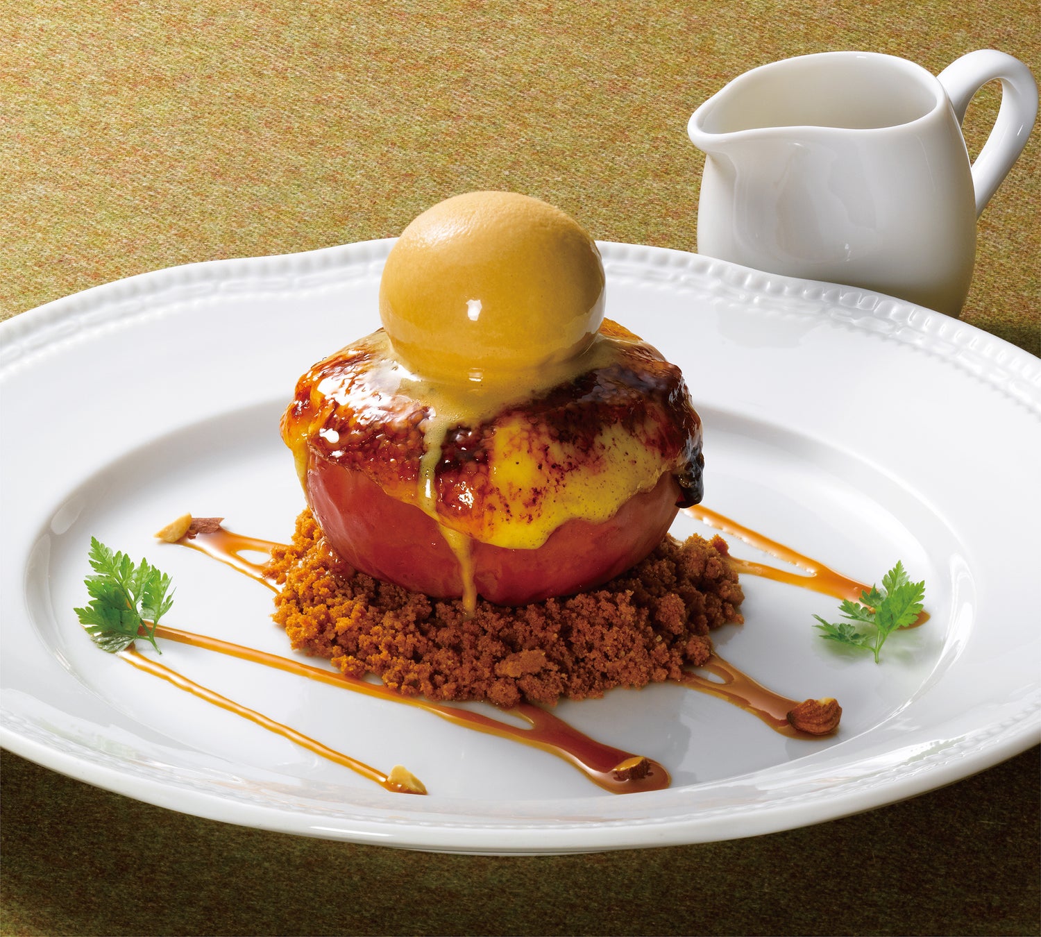 りんご半分をお店で焼き上げ、クレームブリュレ風に。中にはピーカンナッツやレーズンが隠れています。仕上げに香ばしいアーモンドを散らしました。温かいキャラメルソースをかけてお召し上がりください。