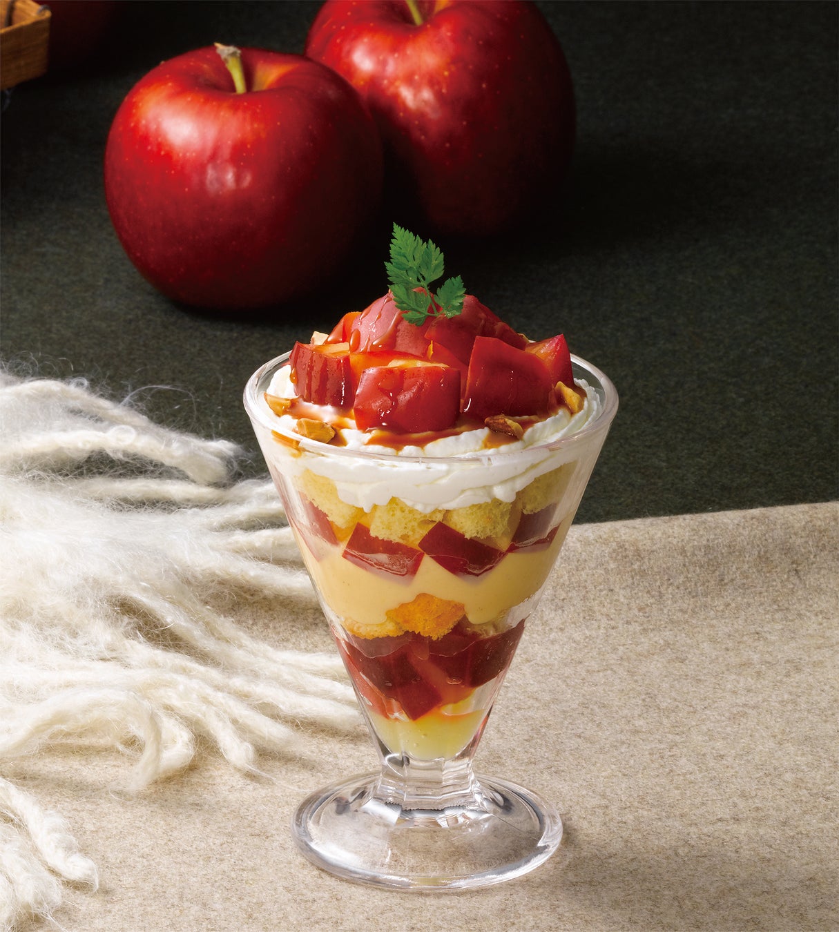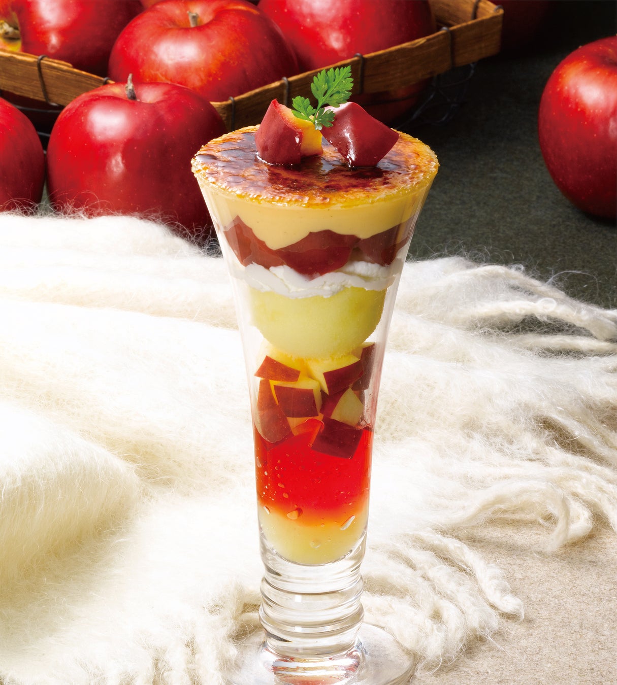 カリッとしたクレームブリュレに焼きりんごやピーカンナッツ、フレッシュりんご、ソルベやゼリーを重ねた様々な素材が織りなす食感や見た目も楽しめるパフェです。