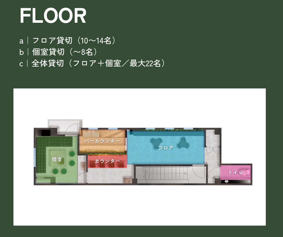 ※10〜20名程度を目安に、人数に合わせて最適な貸切範囲をご案内します。