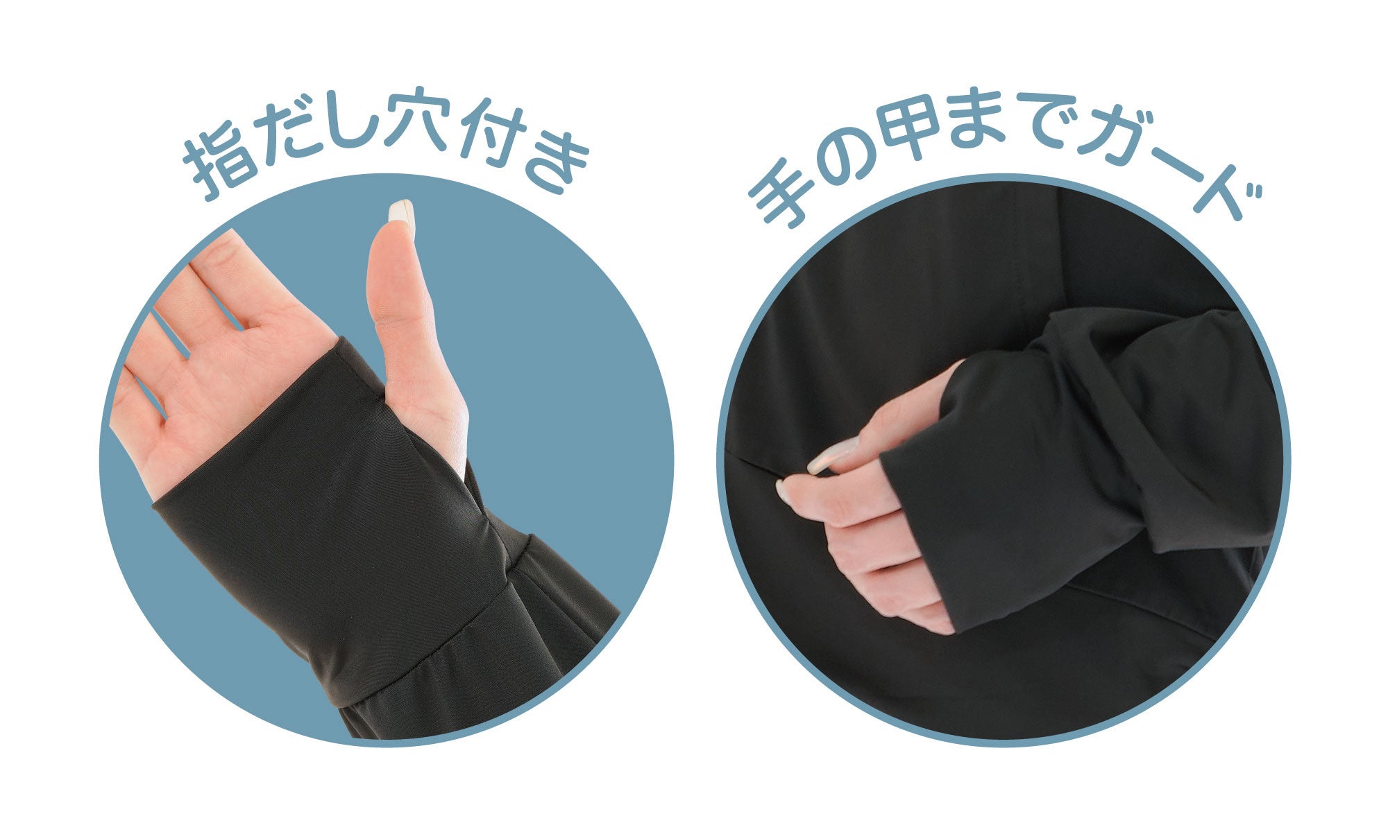 親指が出せる指出し穴付きで、気になる手の甲もガードします。