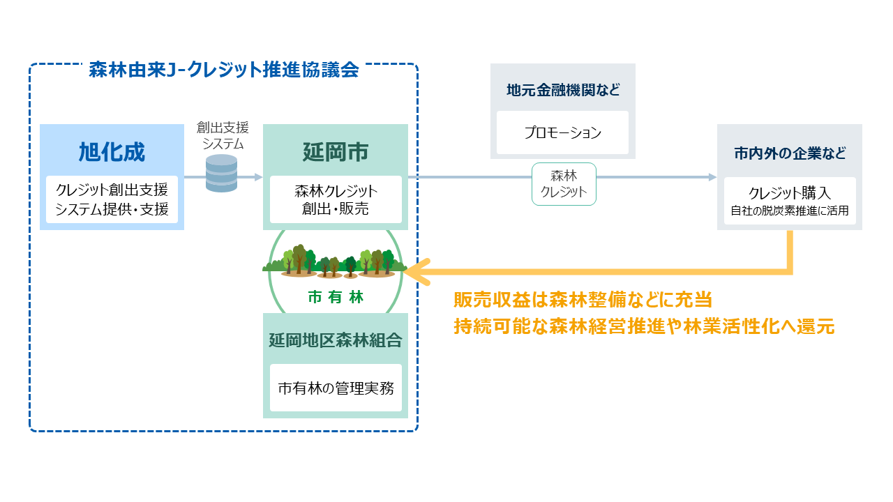 当社は、当社発祥の地であり、多くの事業を展開する延岡市への地域貢献の一環として、2023年より、延岡市や延岡地区森林組合などと連携し、「森林由来J-クレジット推進協議会」において、延岡市の市有林を活用した森林クレジット創出に取り組んできました。スギ素材生産量日本一を誇る宮崎県の中でも、延岡市は最大の森林面積を有しており、豊富な森林資源を活かした新たな価値創出の可能性を模索してきました。以前、市単独で市有林を活用した森林クレジット創出に取り組んだものの、作業負担の大きさや複雑さから、産官連携による協議会での取り組みを開始しました。