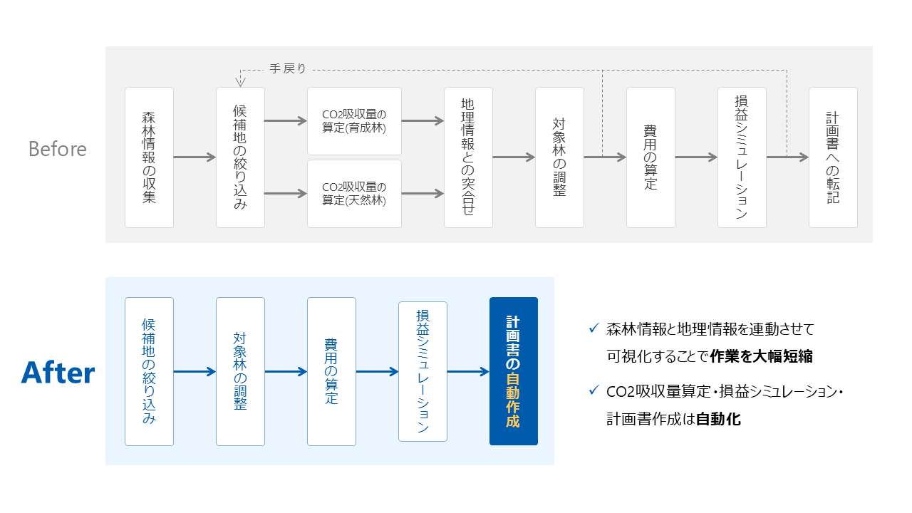 日本は国土の約7割を森林が占める森林大国である一方、管理の担い手不足や高齢化により森林荒廃が進み、土砂災害や生物多様性の喪失といった課題が顕在化しています。森林クレジットは、こうした森林を守り活用する有力な仕組みであるものの、これまでのクレジット創出の過程では、森林簿や森林計画図といった各種データの収集、候補地の選定、吸収量の算定などの作業が必要であり、申請手続きに多大な時間と労力がかかるとともに、専門知識がなければ認証取得が困難という課題がありました。