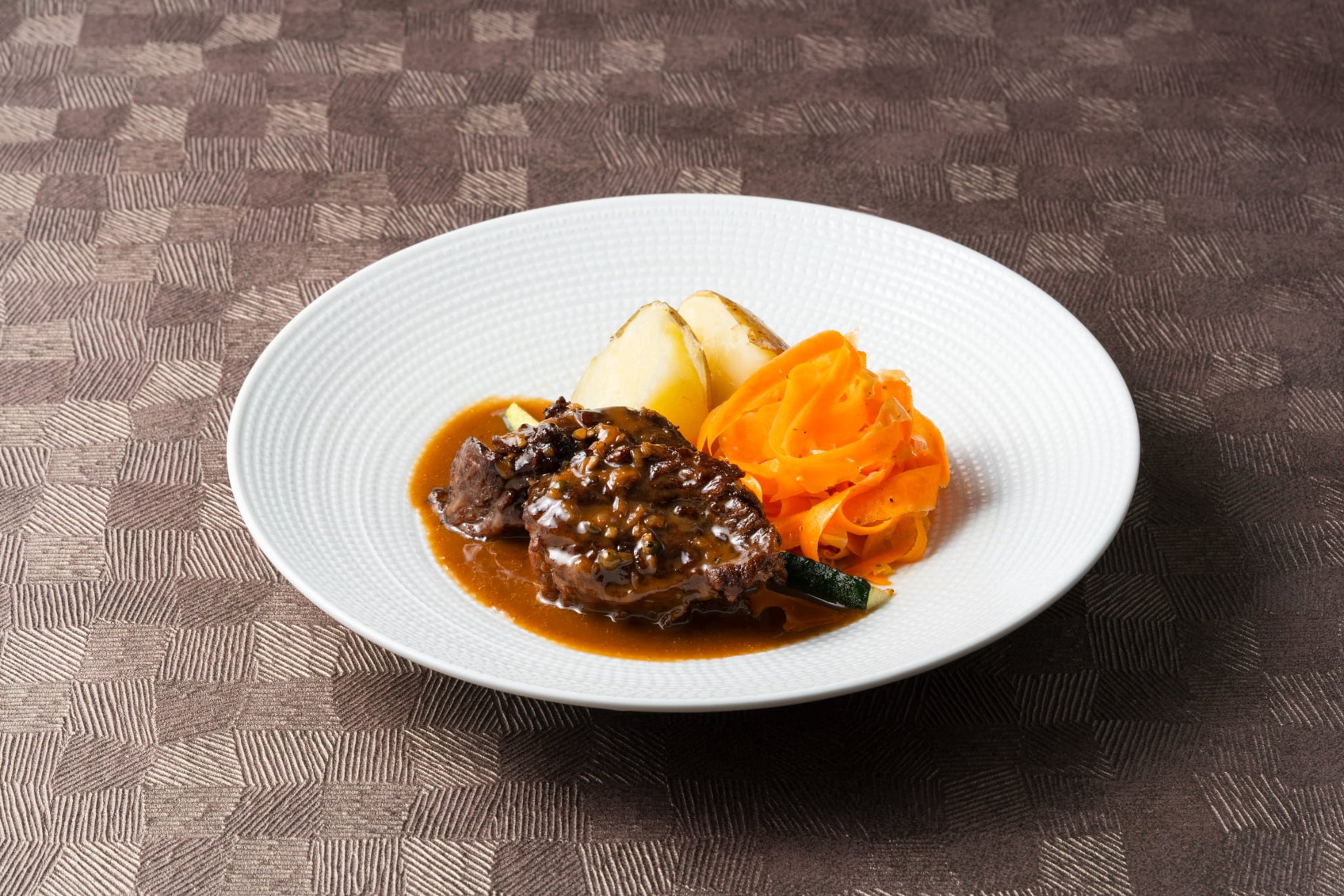 対して日本三大和牛のひとつ「神戸牛」は世界的にも高い評価を受ける霜降りの美しさと、とろけるような口どけが魅力の和牛です。きめ細かく入った脂は融点が低く、口に含んだ瞬間に広がる甘みと香りは、まさに神戸牛ならでは。特別なひとときを演出するにふさわしい存在感を放ちます。