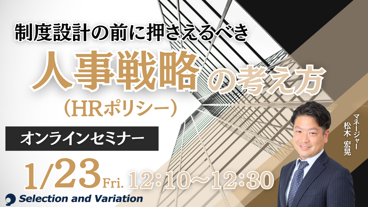 組織・人事コンサルティングファームであるセレクションアンドバリエーション株式会社(以下、当社、東京都千代田区丸の内、大阪市西区、名古屋市西区 / 代表取締役社長:平康慶浩/ URL:https://sele-vari.co.jp/ )は『制度設計の前に押さえるべき 人事戦略(HRポリシー)の考え方』セミナーを2026年1月23日(金)12:10〜12:30に開催することをお知らせいたします。