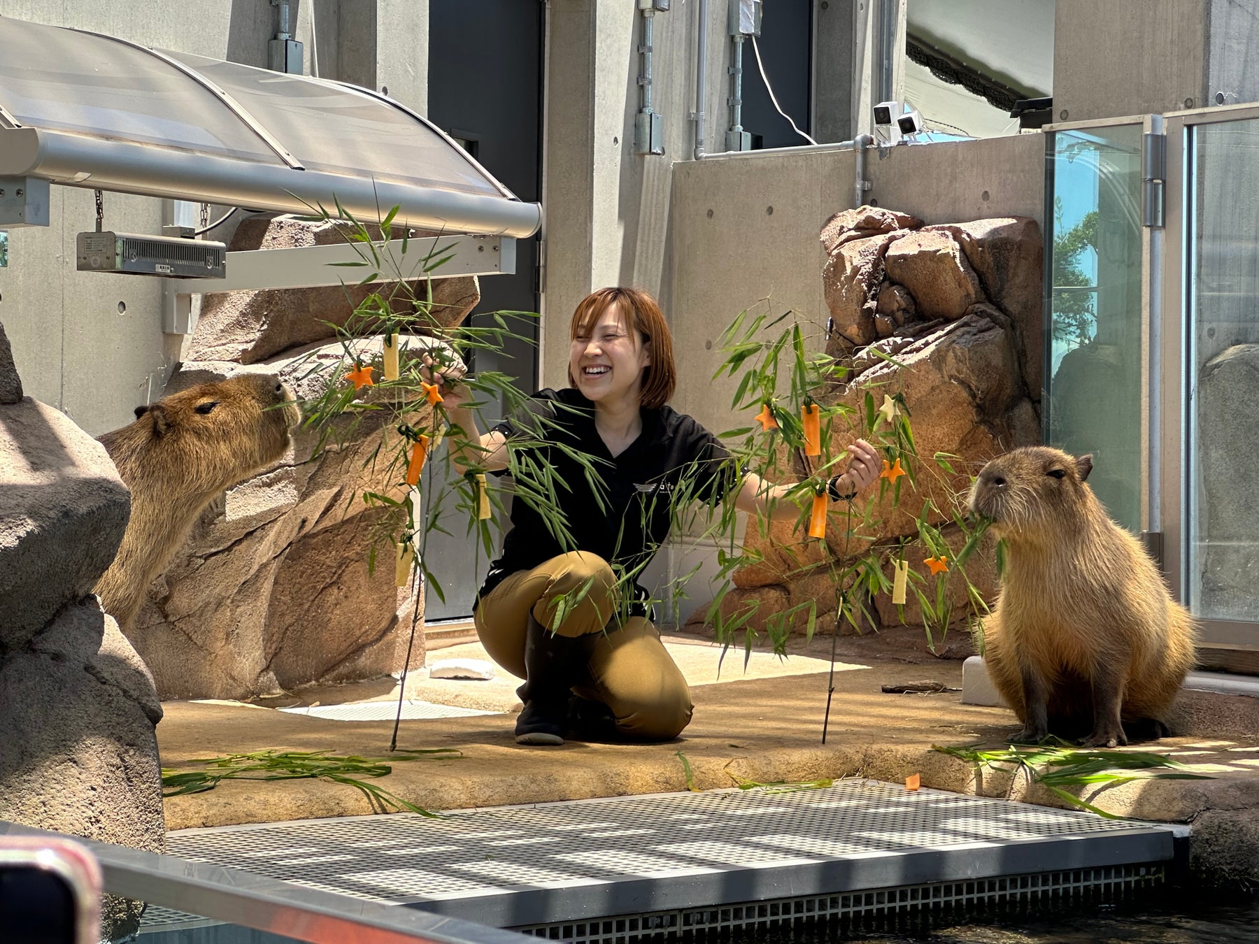 本イベントでは、七夕にちなんで、アトアで暮らすカピバラたちの好物であるサツマイモとニンジンを孟宗竹にくくりつけてプレゼントし、カピバラの生態について知ってもらえるように飼育員が餌やり解説をおこないました。