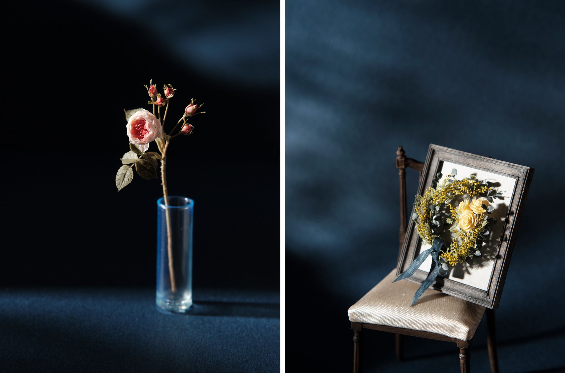 ここは、とあるパリのフラワーショップ。色とりどりの薔薇たちは、すべて樹脂粘土でつくられた1/12サイズのミニチュアローズです。