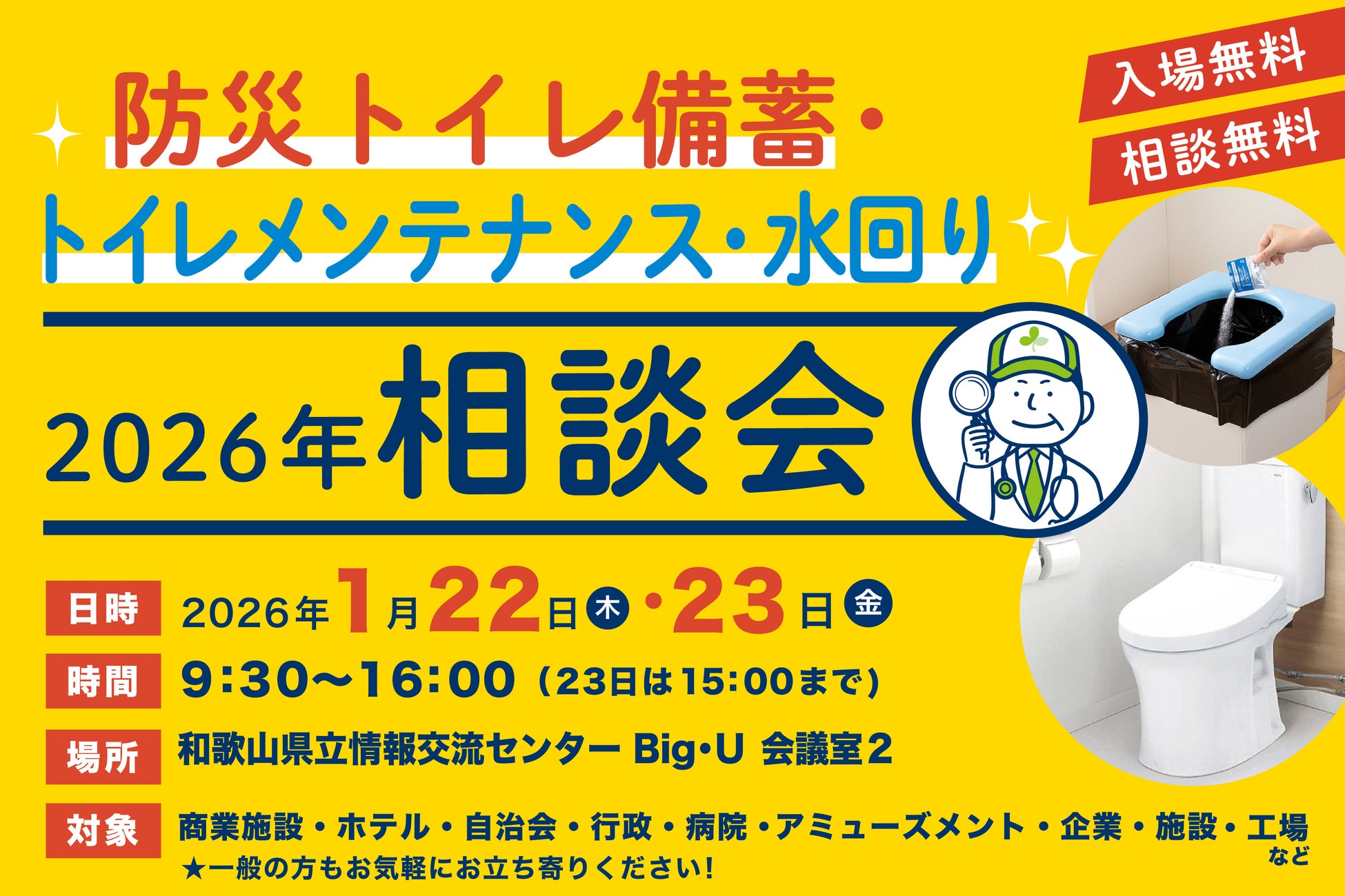 掃除・防災・ペット用品を中心に、生活サポート用品の商品開発から製造、販売までを一気通貫して提供する株式会社サンコー(本社:和歌山県海南市、代表取締役:角谷太基)は、株式会社金子水道工業所様(白浜町)と共催で、商業施設・ホテル・病院・工場などの法人・施設担当者を対象とした「防災トイレ備蓄・トイレメンテナンス・水回り相談会」を、2026年1月22日・23日の2日間にわたり、和歌山県立情報交流センター Big-Uにて開催します。