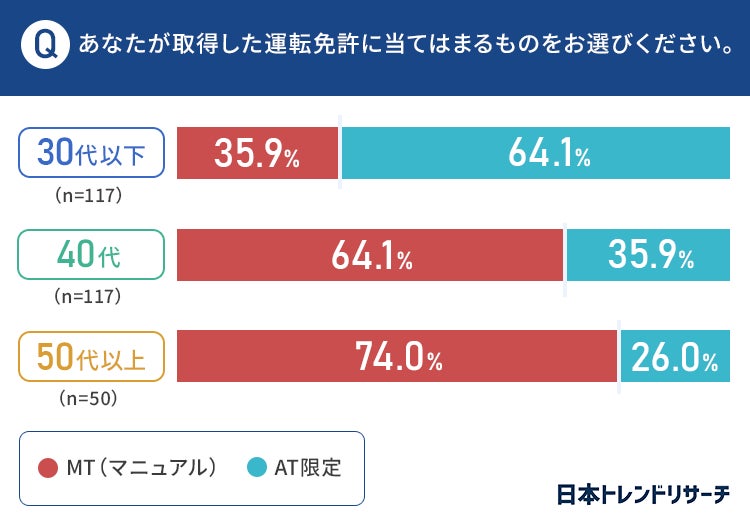 30代以下は「AT限定」のほうが多く、40代、50代以上では「MT」のほうが多い結果になりました。