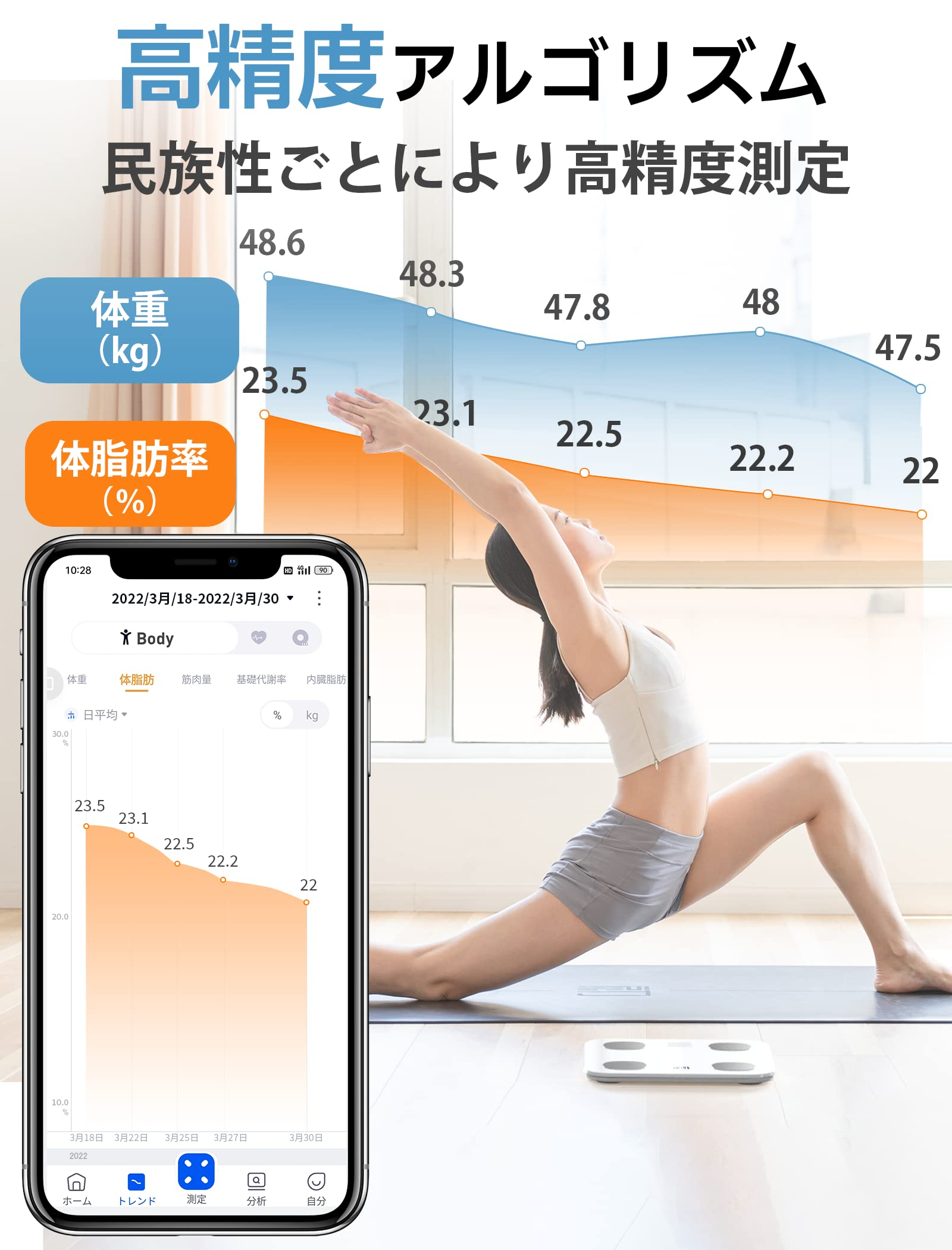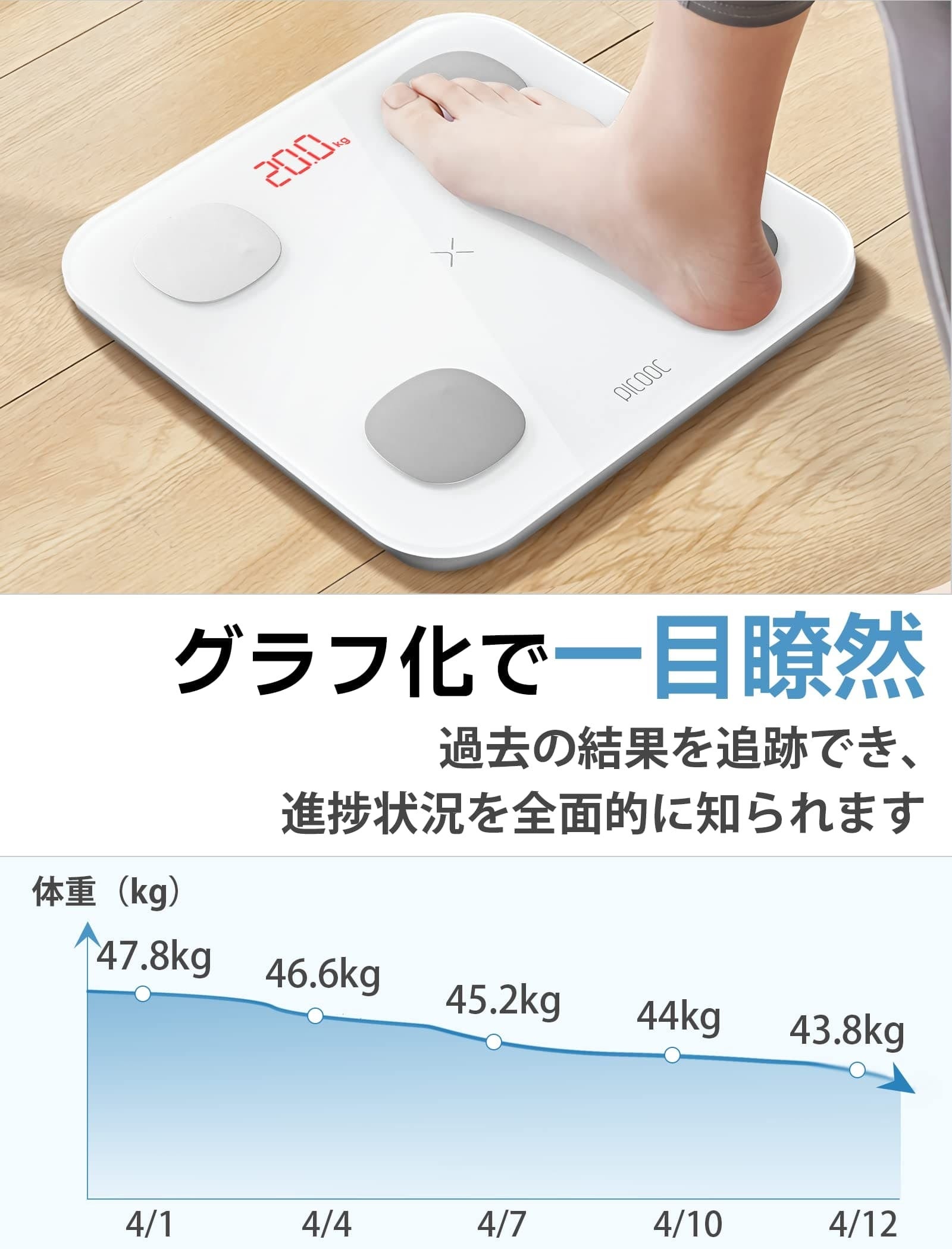⑤スマホ連動するとデータ同期が実現し、Bluetoothで体組成計をスマホと連携すれば、測定データが専用アプリへ自動転送&記録し、充実な測定データでグラフを作成して、体測定値の変動傾向により、ダイエットや体調管理、トレーニングなども最適な体組成計です。