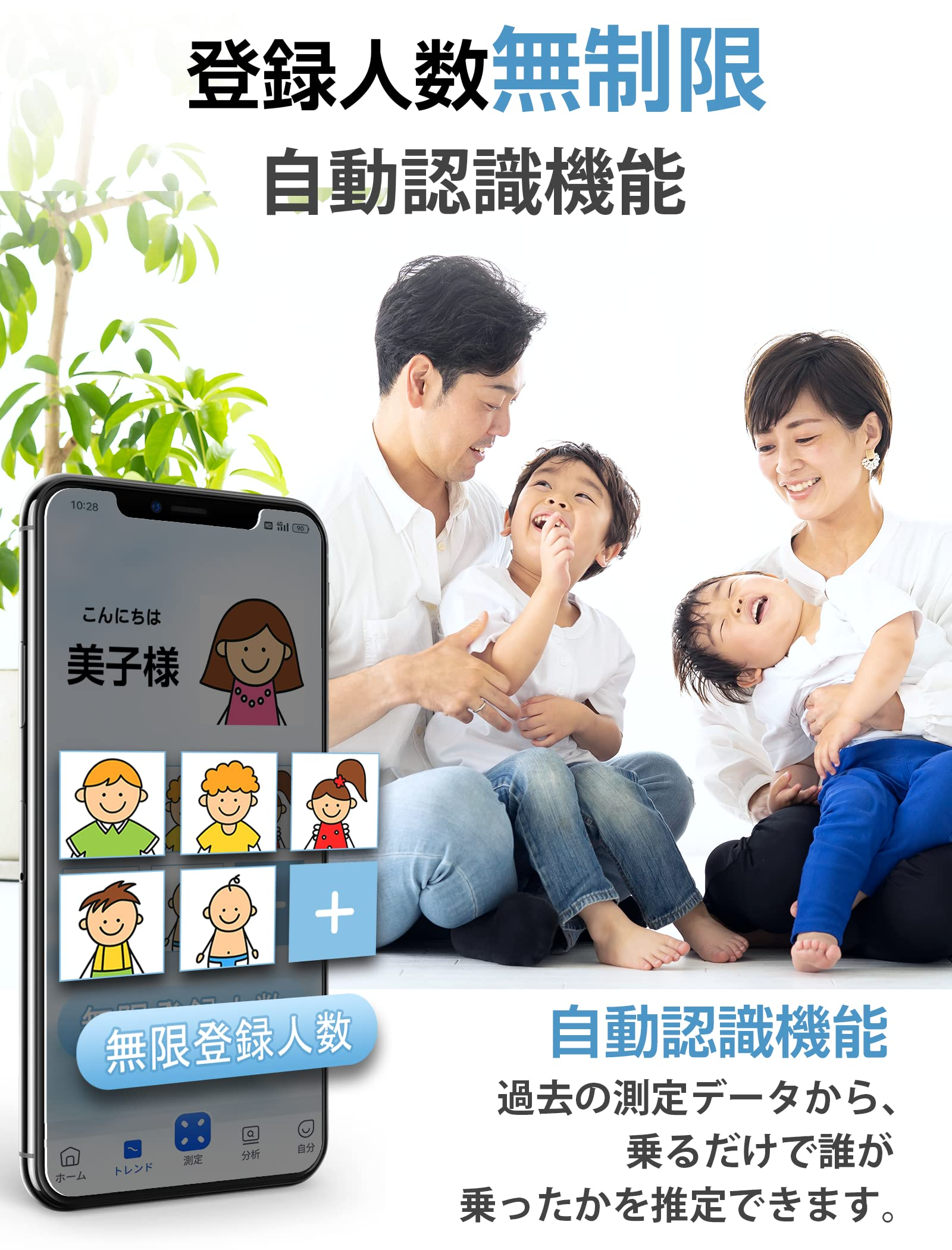 ①弊社のスマホ連動体重計は四つの高精度センサーと高性能電極が搭載され、それにBIA生体電気インピーダンス技術を採用し、測定データが27種類あり、乗るだけで素早く体組成を分析可能です。測定範囲は0.2kgから180kgまで幅広く、さらに測定誤差は100g以内に抑えて、正確に測れます。