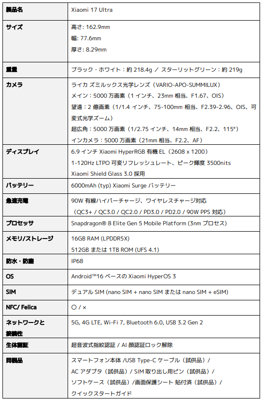 小米技術日本株式会社(以下「シャオミ・ジャパン」、本社:東京都港区)は、スマートフォンの域を超えた撮影体験を提供する最新モデル「Xiaomi 17 Ultra」と、ライカ初の国際市場向けスマートフォン「Leica Leitzphone powered by Xiaomi」の2機種を3月5日に発売いたします。また、一部販売チャネルでは本日より予約を開始いたします。
