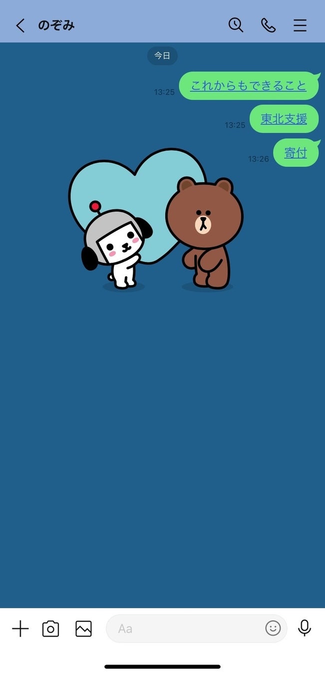 3月11日限定で、「LINE」で友だちや家族に「これからもできること」「東北支援」「寄付」というキーワードを送ると、トークルームの背景にLINE FRIENDSキャラクターのブラウンとYahoo! JAPAN公式キャラクターのけんさくが現れ、ハートを手渡しするアニメーションが表示されます。この仕掛けをひとつのきっかけに、東日本大震災の被災地に向け一人ひとりができる支援について、身近な人と話すことにつながってほしいという思いから実施します。