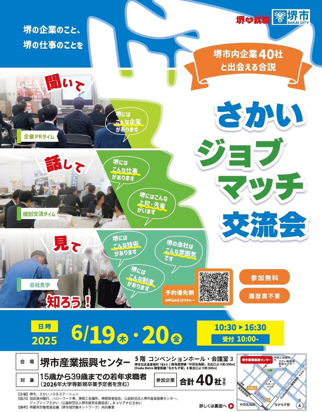 堺の企業40社と“直接”出会える 合同企業説明会「さかいジョブマッチ交流会」を開催します!(6/19(木)・20(金)開催 参加無料)