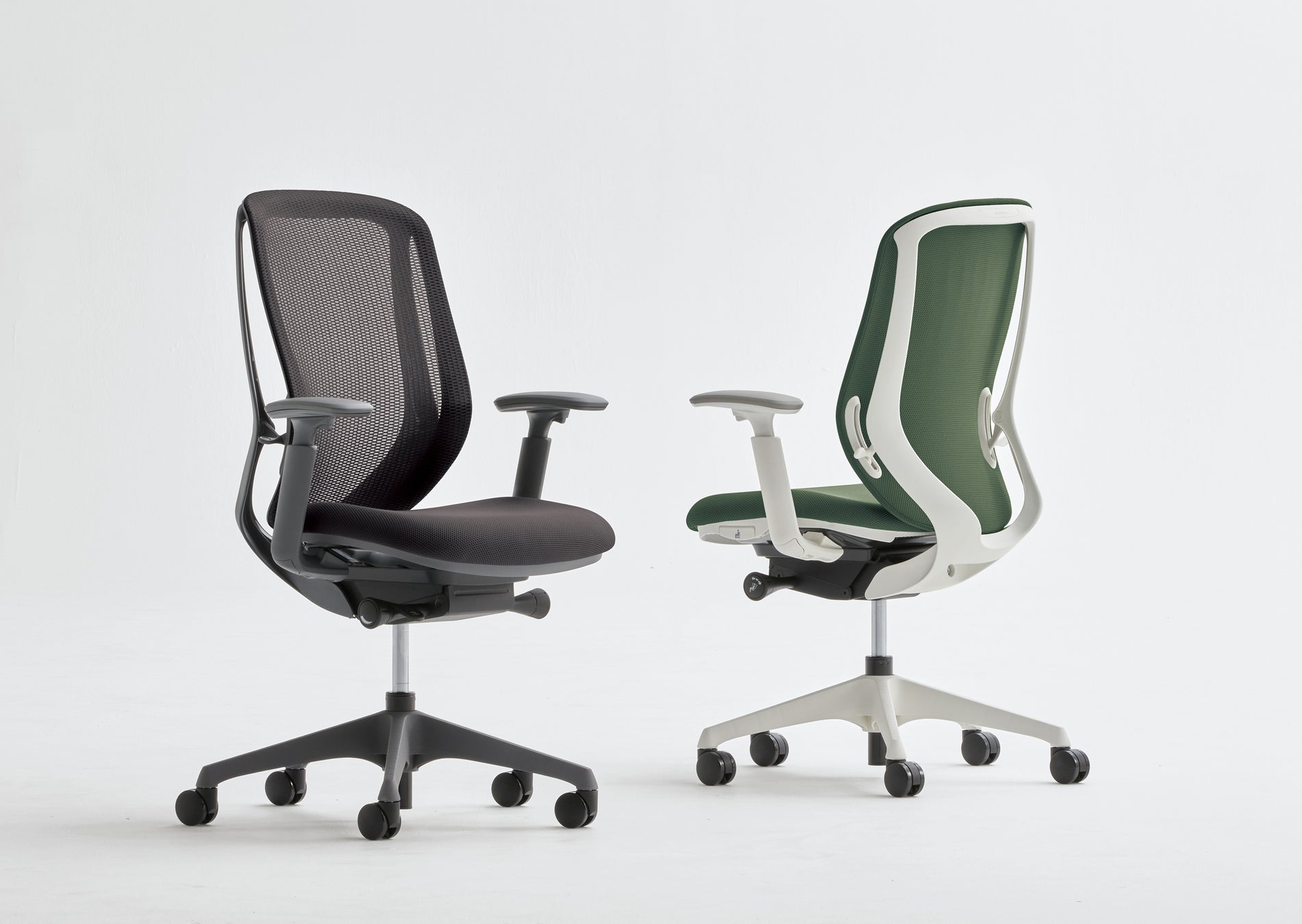 「Sylphy」は、背もたれのカーブを体型に合わせて調節できる「バックカーブアジャスト機構」を搭載し、オフィスで働く一人ひとりのからだに合わせてフィットするシーティングです。2014年に発売し、10年以上にわたり多くの皆さまにご使用いただいています。背の両サイドにあるレバーを動かすことで、背もたれのカーブを2段階で調節でき、包み込まれるような優しい座り心地を実現しています。背のリクライニングは、後方に加え、背と座を前方にリクライニングすることが可能で、パソコン作業や筆記作業時の前傾姿勢をサポートします。座面は高さと奥行きの調節が可能で、クッションはオカムラ独自の異硬度クッションを採用し、快適な座り心地を提供します。美しさと強度を兼ね備えた有機的なフレームと座面の緩やかなカーブが印象的なデザインです。
