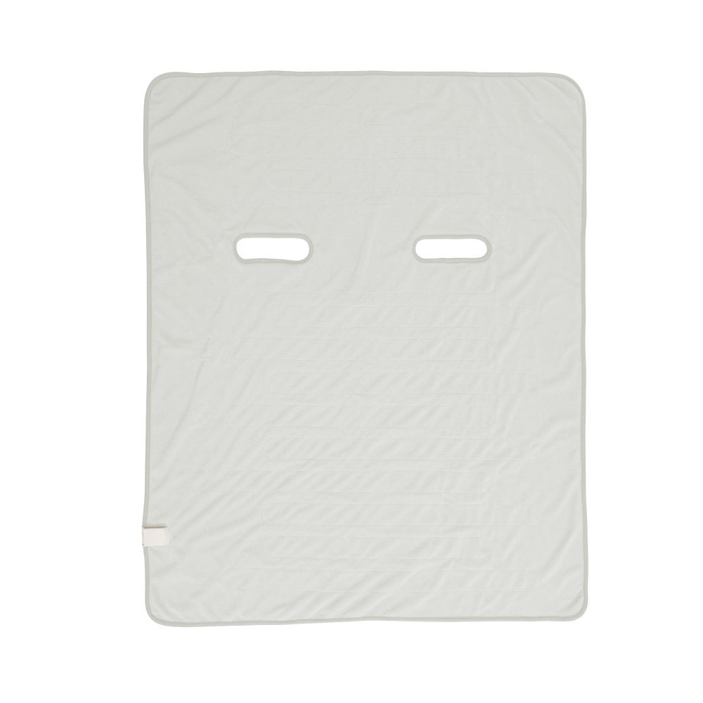 幅125×高さ(長さ)150cm。左右1か所ずつ腕が通せる穴があるデザインを採用。コンセントにコードをつなぎ、有線リモコンの電源スイッチを入れれば毛布内部のヒーターが温かくなります。温度は32度~49度までの設定が可能でスライドスイッチの無段階階切り替え。消費電力は約40Wのため省電力でお使いいただけます。