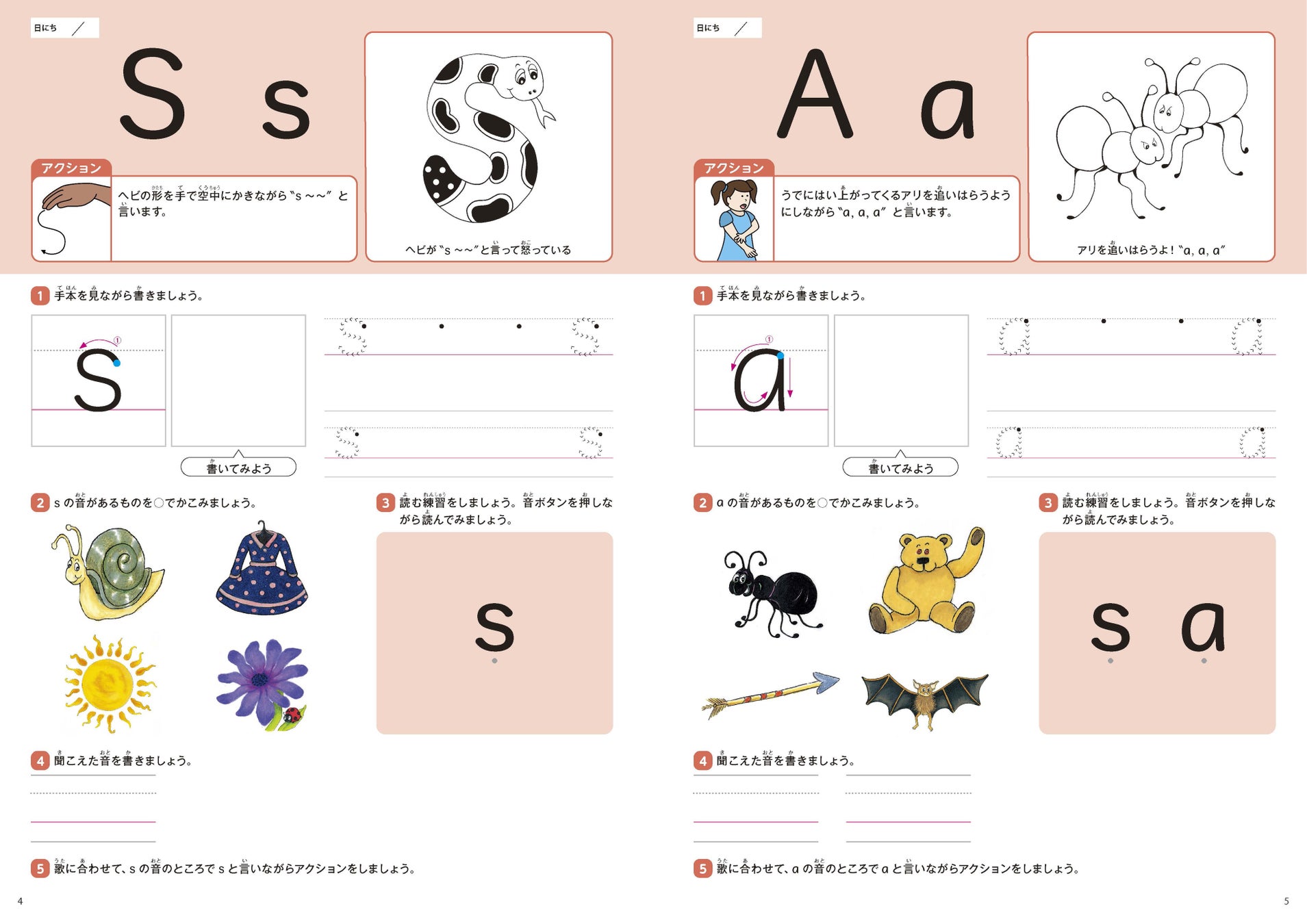 ストーリーや絵本、歌、アクション(動作)などを使い、英語の「音」と「文字」の関係を多感覚で学べる