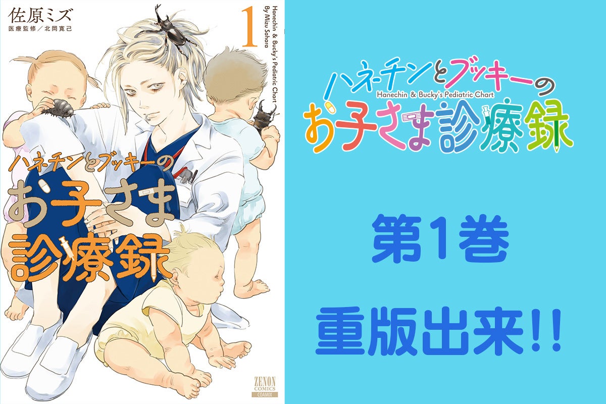 『ハネチンとブッキーのお子さま診療録』は、2023年3月よりゼノン編集部にて連載を開始。誤飲・中耳炎・起立性調整障害…小児医療を描きながら、私たちが生活の中で忘れていた“大切なこと”を教えてくれる『マイガール』佐原ミズ最新作。SNSで瞬く間に話題となった本作は、この度第1巻が重版となった。