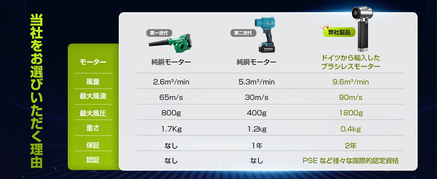 風速160m/s、風量9.5m³/min。プロ仕様の調整機能を搭載