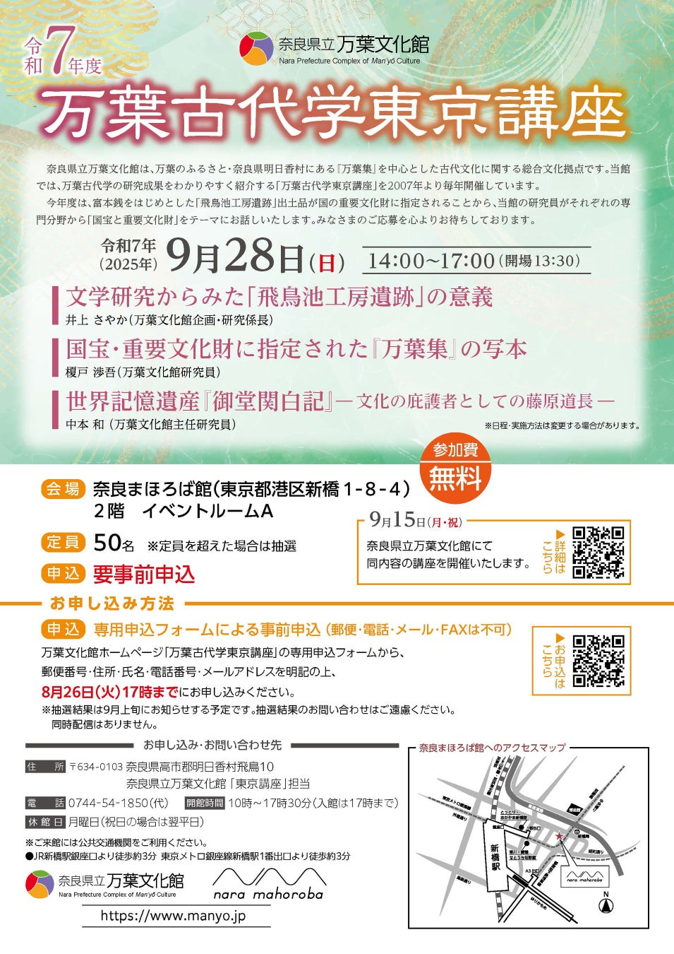 万葉文化館ホームページ「万葉古代学東京講座」の専用申込フォームから、郵便番号・住所・氏名・