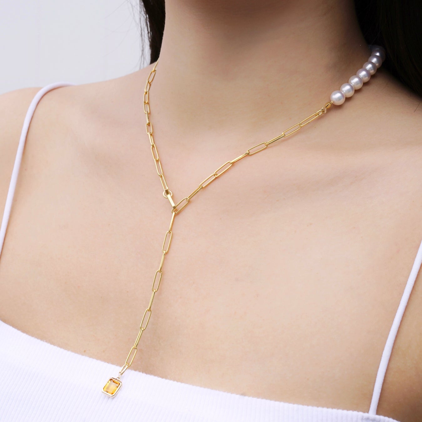 シンプルなデザインでどんなスタイルにも合わせてお使いいただけるだけでなく、先端がフックになっていることで、約45㎝のネックレスとしての着用やパール部分を首元に添わせてチョーカー風に付けていただけます。また、チャームなどを取り付けてお好きなスタイルで楽しんでいただけます。