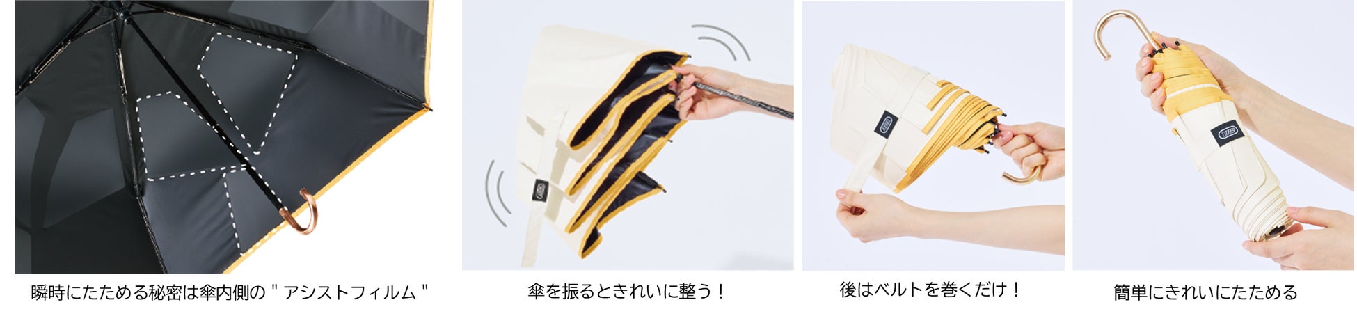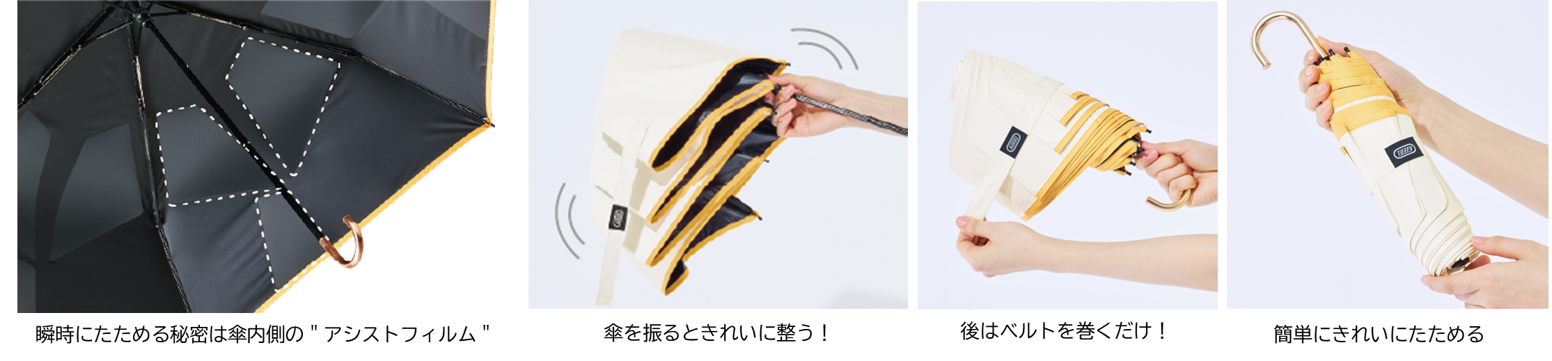 傘内側に施した“アシストフィルム”がガイドとなって折りたたみをサポート。傘を閉じてから軽く振ると、きれいに整います。誰にでも簡単にパッと素早くきれいにたためるので、折りたたみ傘のストレスを解消!