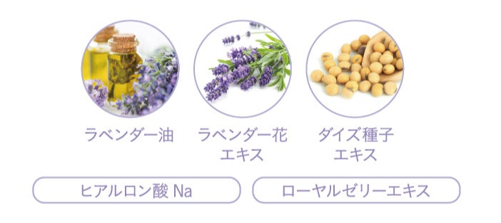 ラベンダー油、ラベンダー花エキス、ヒアルロン酸、ダイズ種子エキス、ローヤルゼリーエキスをはじめとした美容保湿成分を配合。うるおい感のある乳液の様なテクスチャーで、肌を包み込んでしっかり保湿し、乾燥を防いでメイクしたてのうるおいが続きます。